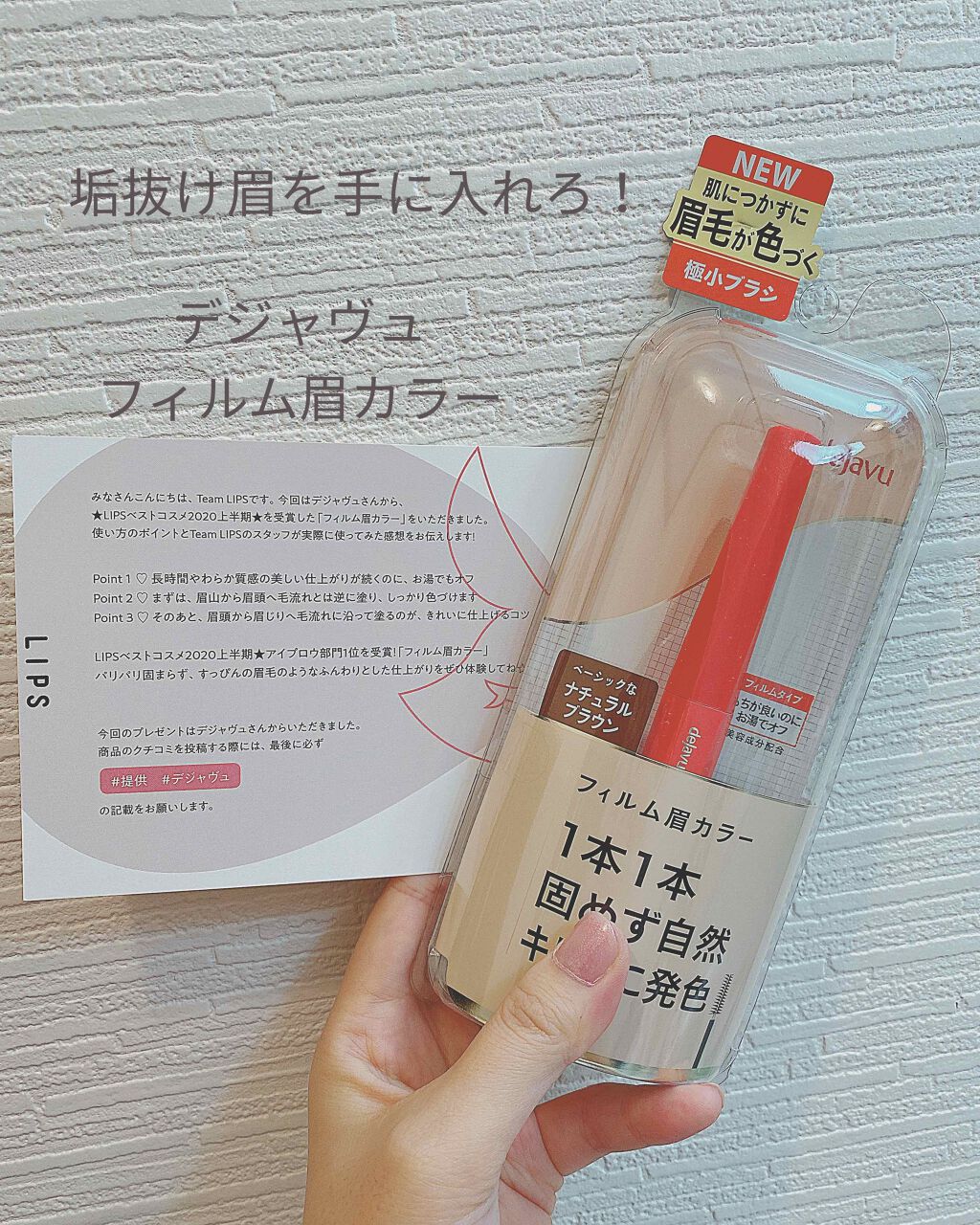 - \\25年3月定番新色モカグレージュ発売// 「フィルム眉カラー」なら眉の印象を自然にやわらげ、ふんわり質感の垢抜け眉に! 1.塗りやすい極小ブラシ ・ 先端直径3mmで、地肌に液がつきにくく根元から色づける ・余分な液がつかない設計で、ティッシュオフ不要 2.眉専用フィルム液 ・眉毛1本1本にキレイに色付き、自眉の黒さをやわらげる ・タバになったり、パリッと固まったりせず、まるで自眉のような仕上がり ・皮脂・汗・こすれに強いのにお湯で簡単オフ (※2025年9月以降、商品パッケージをリニューアル。) デジャヴュ アイブロウカラー