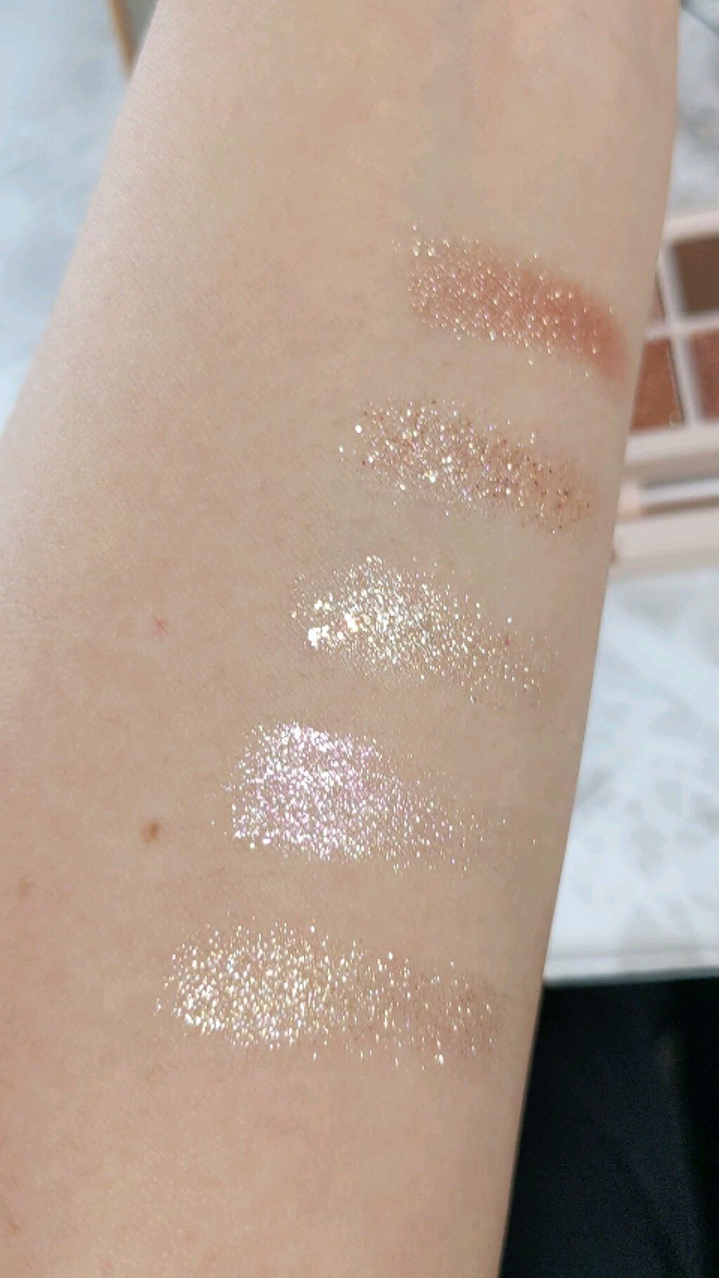 マットの発色をご覧ください。 マットでここまで発色するのって、珍しい。 特にパープル系のマットは、作るのが難しいらしく、ハイブランドでも発色がよくブレンドしやすいマットパープルを作るのに苦労するそう。 ですがこちらのaztkのマットパープルは、一塗りですんごい発色。 しっとりしているわけではないのですが、しっかり密着してくれる感じもします。 逆にパール系は少し発色優しめかな?と思いますが、ニュアンス的に使う分には問題なし。 ラメはギラギラのラメではなくチラチララメで、とっても上品。 いろんなシャドウと組み合わせて無限大にアイメイクが楽しめそうです。
