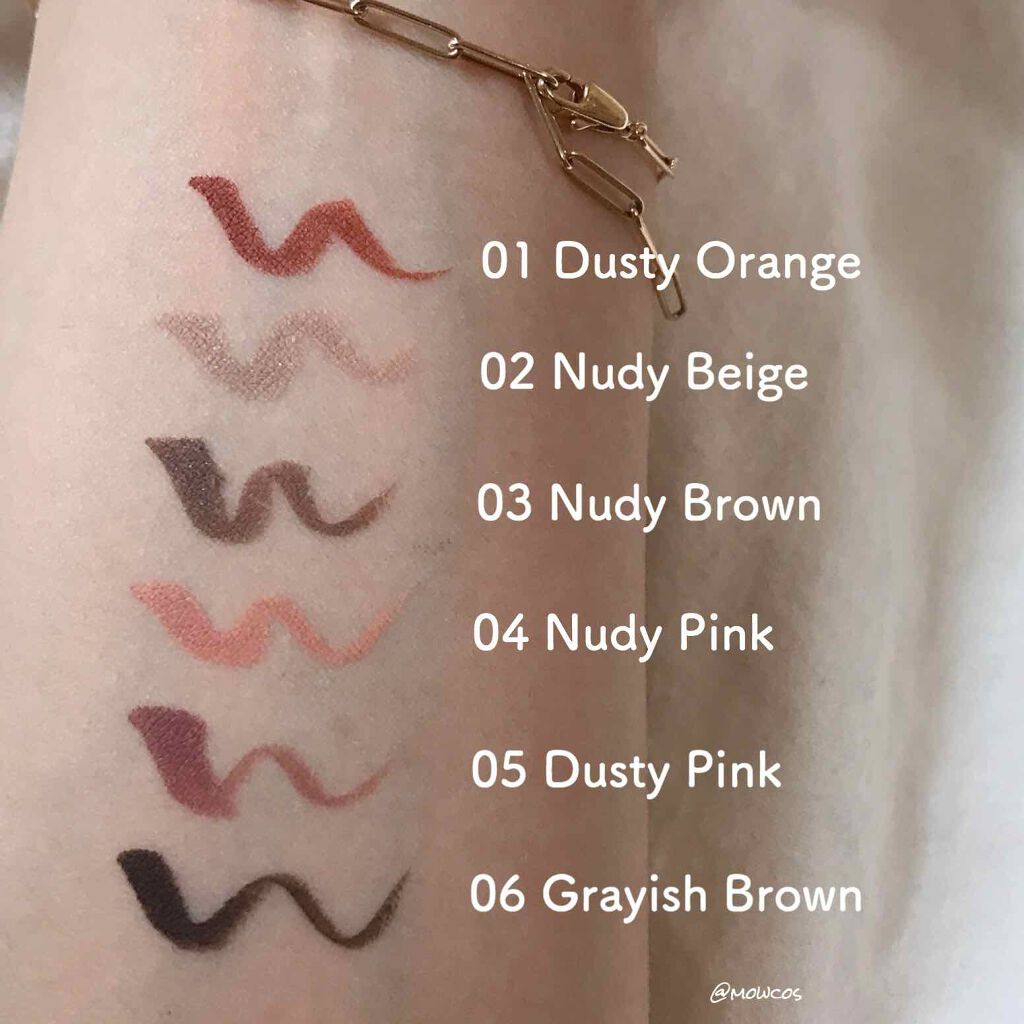 液含みのいいフェルトチップです。にじみにくくこすっても全然落ちませんがお湯オフタイプなのでお湯で簡単に落ちます。 ブラウンとラベンダーが混ざってくすみのある落ち着いた、でも少しかわいさもある色味です。 発色はよくて派手にならずにどの色のアイシャドウとでも合うと思います。