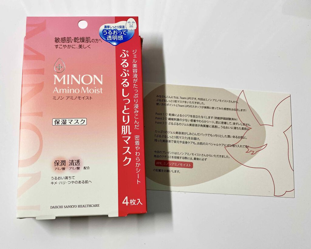 - 思わず触れたくなるほどみずみずしい肌へ。うるおって透明感。 乾燥による小ジワを目立たなくします(効能評価試験済み) 水分を保つ機能が低下しがちな角質層に、バリア機能をサポートする保湿成分を補給 ぷるぷるジェルがしみこんだ密着やわらかシートで、液ダレしません ◎ミノン アミノモイストのシートマスクは化粧水で肌を整えた後にお使いいただく「美容液マスク」です。 週に1-2回のスペシャルケアとしておすすめです♪