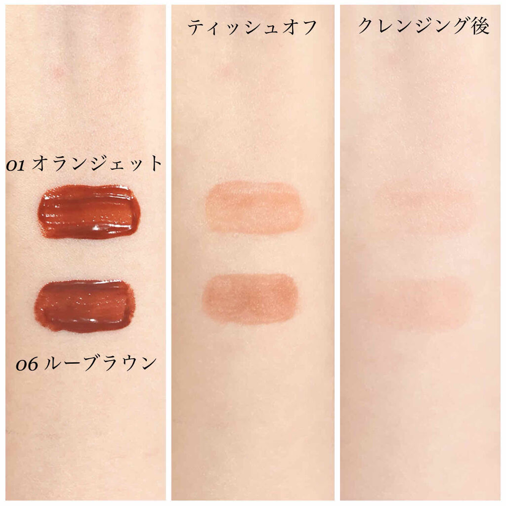 薄膜で高発色。ピタッと密着します。 高発色なのに、仕上がりが上から透明グロスを重ねたかのようなちゅるんとした感じになれるのが素敵。 色持ちが他のティントに比べてとても良いのに、まさかの水クレンジングで擦らず優しく撫でるだけでするんと落ちました! 発色が良いのにナチュラルにも仕上げられるし、どの色で組み合わせても、オシャレにまとまるので、濃淡や組み合わせを変えて色々試すのが楽しい♪ 最後のページに全色比較をのせたので、参考になると嬉しいです。