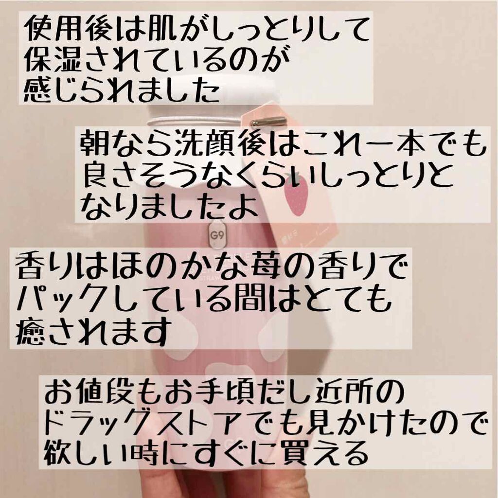 - G9シリーズの洗い流さないバブルエッセンスパック。肌になじませると、しゅわしゅわ細かいミルクバブルがはじける新感覚な炭酸美容パックです。牛乳タンパクエキス×炭酸バブルが肌にうるおいを与え透明感のある肌へ導きます。牛乳タンパク質抽出物などの36種類の美容成分で、しっとりと潤いながらも、重くならずに、スムーズなメイクのりを実現。PLAINはくすみや乾燥が気になる方に、STRAWBERRYは毛穴や肌のキメを整えたい方へおすすめです。KFDA(韓国食品医薬品安全庁)の美白、しわ改善機能性承認済み。※韓国基準