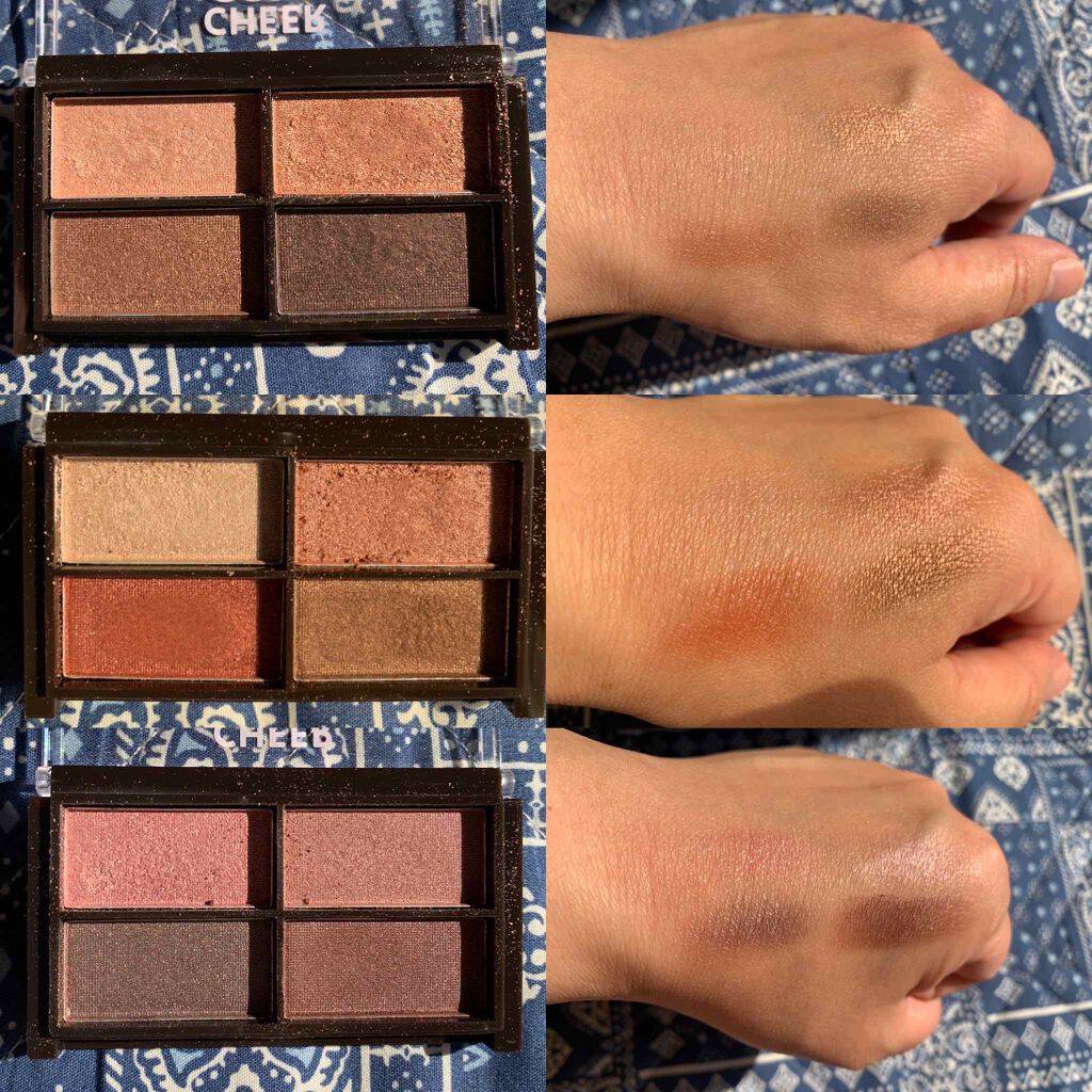 普段、ラメ入りのアイシャドウしか使わないからか、右下のマットの色が私には難しくて😅ベースに使うくらいでしょうか。 右上のラメは本当に使いやすいのですが😂 左上のラメは多きめなので、乗せすぎないように気を付けています。