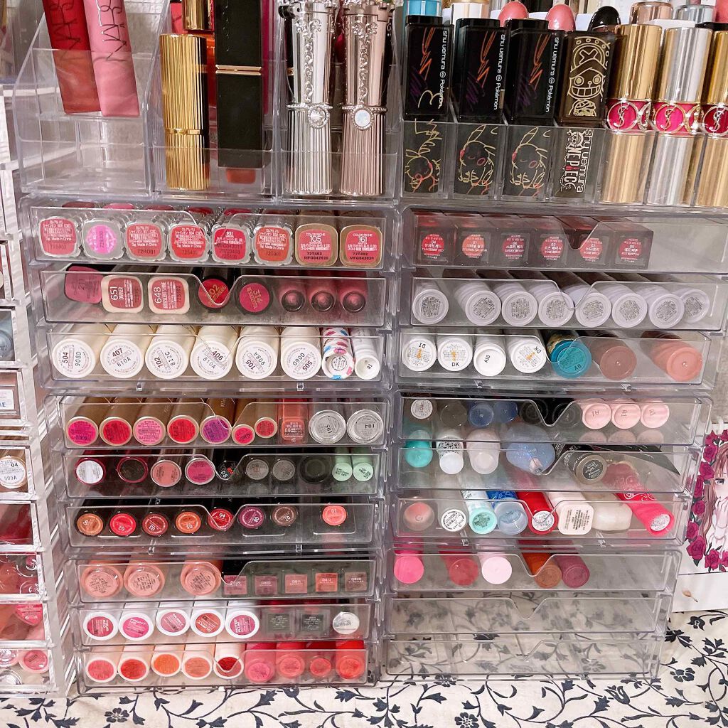無印良品のケースには、私が大事にしているリップ類を収納しています🤭♡ あとデパコスのアイシャドウにも使ってます! 理由⇨厚みがあり、しっかり頑丈な作りだから割れの心配がないため❗️ 金額的には、『ダイソー`のが安いし買いやすい.