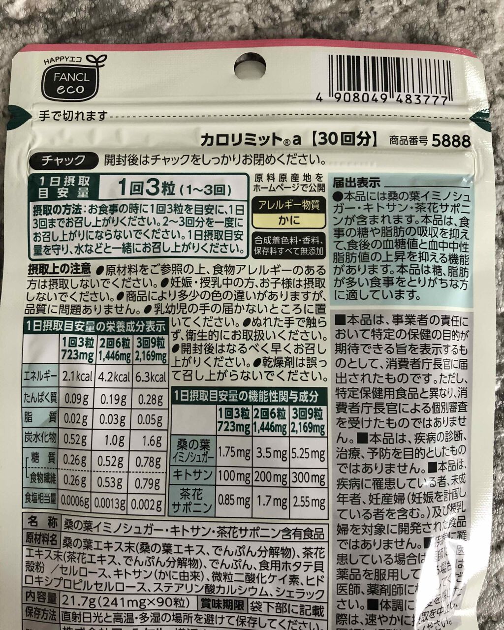- 【機能性表示食品】 食事の糖や脂肪の吸収を抑えるカロリミット。注目の「茶花サポニン」に、桑の葉イミノシュガー、キトサンの3成分がしっかり働きます!食後の血糖値と中性脂肪値の上昇を抑える機能があります。糖や脂肪が多い食事をとりがちな方に。 (届出表示)本品には桑の葉イミノシュガー・キトサン・茶花サポニンが含まれます。本品は、食事の糖や脂肪の吸収を抑えて、食後の血糖値と血中中性脂肪値の上昇を抑える機能があります。本品は糖、脂肪が多い食事をとりがちな方に適しています。 【1回の目安】 3粒(1日1~3回) 【機能性関与成分/1回3粒当たり】 桑の葉イミノシュガー:1.75mg、キトサン:100mg、茶花サポニン:0.85mg 【機能性表示食品についてのご注意】 ※本品は、特定保健用食品と異なり、消費者庁長官による個別審査を受けたものではありません。 ※疾病の診断、治療、予防を目的としたものではありません。 ※食生活は、主食、主菜、副菜を基本に、食事のバランスを。 【アレルゲン(28品目中)】 かに 【ご注意】 ※妊娠・授乳中の方、お子様はお召し上がりにならないでください。