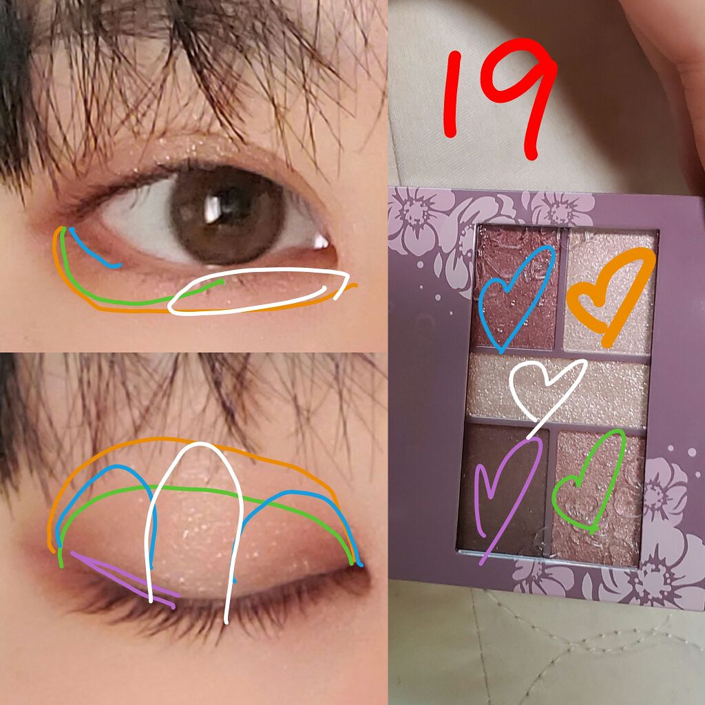 - 1枚のパレットで2つのスタイルが完成! 5色の欲ばりアイシャドウ♥ メインカラーを選んで2つのスタイルが楽しめる! A→B→D でスタイル1 A→C→D でスタイル2 繊細な粉質が、しっとりとまぶたに密着して色落ちを防ぎます。 透明感のあるキラうるトッピングジュエル(繊細ラメ)は、気分によってトッピング!