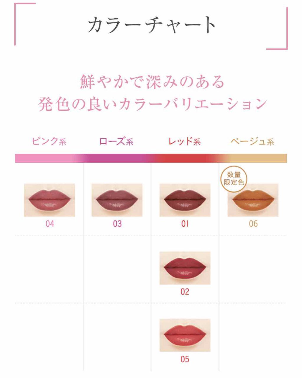 - <01> リンゴ酸ジイソステアリル、テトライソステアリン酸ジペンタエリスリチル、イソノナン酸イソトリ デシル、オクチルドデカノール、水添ポリイソブテン、ジカプリン酸ネオペンチルグリコール、ヘキサヒド ロキシステアリン酸ジペンタエリスリチル、ビスアルキル(C16-18)グリセリルウンデシルジメチコン、パ ラフィン、(ベヘン酸/ポリヒドロキシステアリン酸)ペンタエリスリチル、合成ワックス、マイクロクリスタ リンワックス、セレシン、メトキシケイヒ酸エチルヘキシル、PEG-12ジメチコン、ラウロイルグルタミン酸 ジ(オクチルドデシル/フィトステリル/ベヘニル)、パルミトイルヒドロキシプロピルセルロース、ジステ アルジモニウムヘクトライト、スクワラン、炭酸プロピレン、酢酸トコフェロール、BHT、グリチルレチン酸 ステアリル、シメチコン、カミツレ花エキス、(+/-)セルロース、パルミチン酸、マイカ、ラウロイルアスパ ラギン酸Na、塩化亜鉛、酸化チタン、酸化鉄、水酸化Al、硫酸Ba、トリイソステアリン酸イソプロピル チタン、トリエトキシカプリリルシラン、合成フルオロフロゴパイト、黄4、青1、赤104(1)、赤201、赤202 <02> テトライソステアリン酸ジペンタエリスリチル、イソノナン酸イソトリデシル、オクチルドデカノール、リン ゴ酸ジイソステアリル、水添ポリイソブテン、ジカプリン酸ネオペンチルグリコール、ヘキサヒドロキシステア リン酸ジペンタエリスリチル、ビスアルキル(C16-18)グリセリルウンデシルジメチコン、パラフィン、(ベヘ ン酸/ポリヒドロキシステアリン酸)ペンタエリスリチル、合成ワックス、ラウロイルグルタミン酸ジ(オクチ ルドデシル/フィトステリル/ベヘニル)、マイクロクリスタリンワックス、セレシン、メトキシケイヒ酸エチル ヘキシル、PEG-12ジメチコン、パルミトイルヒドロキシプロピルセルロース、ジステアルジモニウムヘクトラ イト、ヒドロキシステアリン酸エチルヘキシル、スクワラン、炭酸プロピレン、酢酸トコフェロール、BHT、グリチ ルレチン酸ステアリル、シメチコン、カミツレ花エキス、(+/-)セルロース、パルミチン酸、マイカ、ラウロ イルアスパラギン酸Na、塩化亜鉛、酸化チタン、酸化鉄、水酸化Al、硫酸Ba、トリイソステアリン酸イソプ ロピルチタン、トリエトキシカプリリルシラン、合成フルオロフロゴパイト、黄4、黄5、赤104(1)、赤201、赤202 <03> リンゴ酸ジイソステアリル、テトライソステアリン酸ジペンタエリスリチル、イソノナン酸イソトリ デシル、オクチルドデカノール、水添ポリイソブテン、ジカプリン酸ネオペンチルグリコール、ヘキサヒド ロキシステアリン酸ジペンタエリスリチル、ビスアルキル(C16-18)グリセリルウンデシルジメチコン、パ ラフィン、(ベヘン酸/ポリヒドロキシステアリン酸)ペンタエリスリチル、合成ワックス、マイクロクリスタ リンワックス、セレシン、メトキシケイヒ酸エチルヘキシル、PEG-12ジメチコン、ラウロイルグルタミン酸 ジ(オクチルドデシル/フィトステリル/ベヘニル)、パルミトイルヒドロキシプロピルセルロース、ジステ アルジモニウムヘクトライト、スクワラン、炭酸プロピレン、酢酸トコフェロール、BHT、グリチルレチン酸 ステアリル、シメチコン、カミツレ花エキス、(+/-)セルロース、パルミチン酸、マイカ、ラウロイルアスパ ラギン酸Na、塩化亜鉛、酸化チタン、酸化鉄、水酸化Al、硫酸Ba、トリイソステアリン酸イソプロピル チタン、トリエトキシカプリリルシラン、合成フルオロフロゴパイト、黄4、青1、赤104(1)、赤201、赤202 <05> リンゴ酸ジイソステアリル、テトライソステアリン酸ジペンタエリスリチル、イソノナン酸イソトリ デシル、オクチルドデカノール、水添ポリイソブテン、ジカプリン酸ネオペンチルグリコール、ヘキサヒド ロキシステアリン酸ジペンタエリスリチル、ビスアルキル(C16-18)グリセリルウンデシルジメチコン、パ ラフィン、(ベヘン酸/ポリヒドロキシステアリン酸)ペンタエリスリチル、合成ワックス、マイクロクリスタ リンワックス、セレシン、メトキシケイヒ酸エチルヘキシル、PEG-12ジメチコン、ラウロイルグルタミン酸 ジ(オクチルドデシル/フィトステリル/ベヘニル)、パルミトイルヒドロキシプロピルセルロース、ジステ アルジモニウムヘクトライト、スクワラン、炭酸プロピレン、酢酸トコフェロール、BHT、グリチルレチン酸 ステアリル、シメチコン、カミツレ花エキス、(+/-)セルロース、パルミチン酸、マイカ、ラウロイルアスパ ラギン酸Na、塩化亜鉛、酸化チタン、酸化鉄、水酸化Al、硫酸Ba、トリイソステアリン酸イソプロピル チタン、トリエトキシカプリリルシラン、合成フルオロフロゴパイト、黄4、青1、赤104(1)、赤201、赤202 <07 ラズベリーチョコレート> テトライソステアリン酸ジペンタエリスリチル、イソノナン酸イソトリデシル、オクチルドデカノール、水添ポリイソブテン、ジカプリン酸ネオペンチルグリコール、リンゴ酸ジイソ