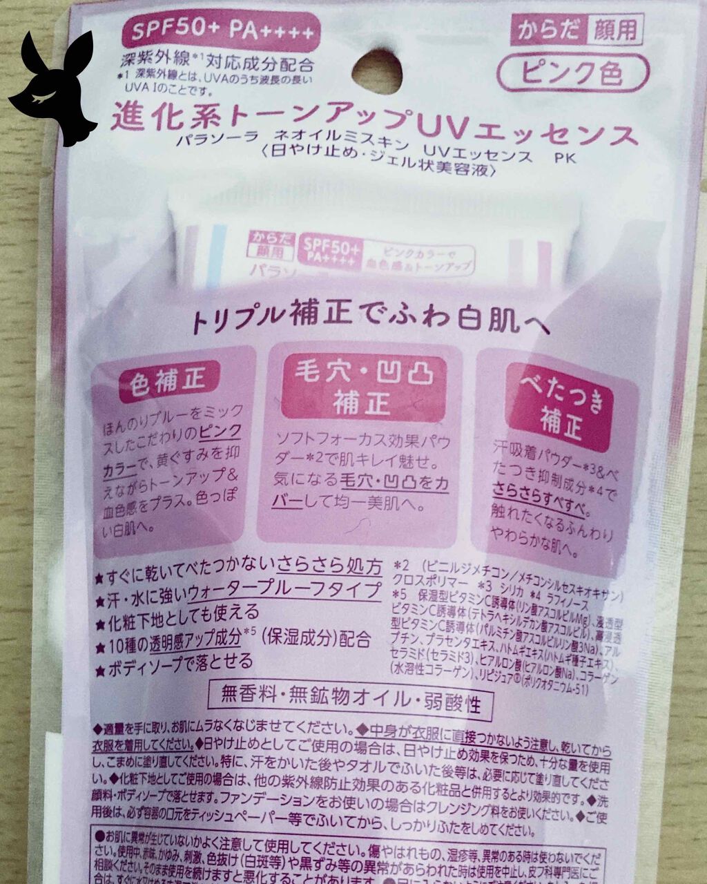 - トーンアップするだけの日焼け止めに満足できない人に。 トリプル補正効果搭載! 進化系トーンアップUV(*1) 【パラソーラ ネオイルミスキン UVエッセンス PK】誕生! ▽基本情報▽ SPF50+/PA++++。 トリプル補正効果搭載で理想の白肌へ。 ①色補正(*1):ピンクカラーで血色感&トーンアップ。黄ぐすみを抑えながらトーンアップし、血色感を高めることで上気したような白肌へ。 ②毛穴補正(*1):ソフトフォーカス効果パウダー((ビニルジメチコンメチコンシルセスキオキサン)クロスポリマー)配合で肌キレイ魅せ。気になる毛穴・凹凸をカバーし、均一美肌へ。 ③べたつき補正:汗吸着パウダー(シリカ)・べたつき抑制成分(ラフィノース)配合で、さらさら、すべすべ。触れたくなるふんわりやわらかな肌へ。 ●深紫外線対応成分、10種の美容成分(*2)(保湿成分)配合。 ●汗、水に強いウォータープルーフタイプ。ボディソープで落とせます。 ●化粧下地としても。 ●無香料・無鉱物オイル・弱酸性。 *1 メイク効果 *2 保湿型ビタミンC誘導体(リン酸アスコルビルMg)、浸透型ビタミンC誘導体(テトラヘキシルデカン酸アスコルビル)、高浸透型ビタミンC誘導体(パルミチン酸アスコルビルリン酸3Na)、アルブチン、プラセンタエキス、ハトムギエキス(ハトムギ種子エキス)、セラミド(セラミド3)、ヒアルロン酸(ヒアルロン酸Na)、コラーゲン(水溶性コラーゲン)、リピジュア○R(ポリクオタニウム-51)
