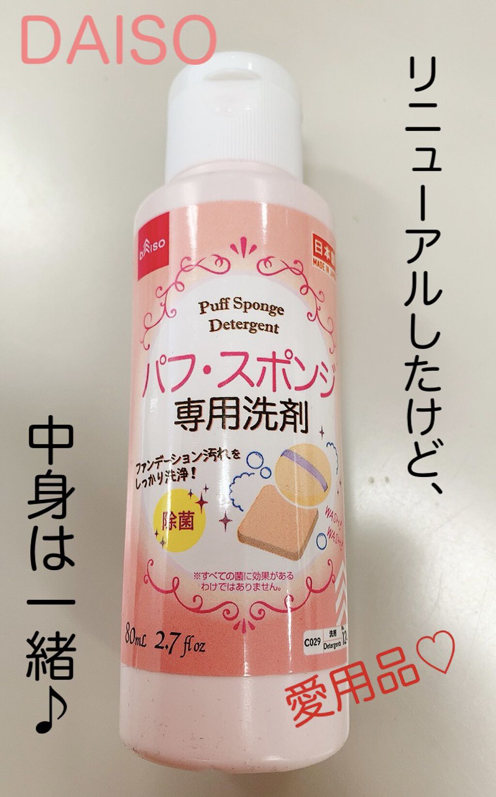 【購入品】使い切りレビュー良い点ダイソーで買える食器用(中性)洗剤よりもキレイにファンデ落ちるこちらの洗剤を使用して洗ったスポンジでメイクしても肌トラブルなかったです汚れている部分にかかるように洗剤たっぷりつけて揉み洗いするとキレイに落ちます...