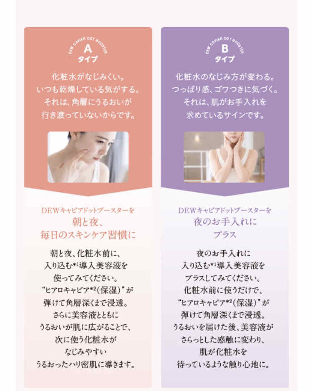 - “ヒアロキャビア※(保湿)”がつかうたびに弾け、美容液とともに、お肌に隙間なく広がります。次に使う化粧水をなじみやすくし、角層深くにうるおいを届け、ハリ密肌に導く美滴導入美容液です。 ※ ヒアルロン酸Naなどをキャビア状カプセルに閉じ込めた保湿成分(ヒアルロン酸Na、カンテン、カラギーナン、シリカ、マイカ、酸化鉄、酸化チタン)