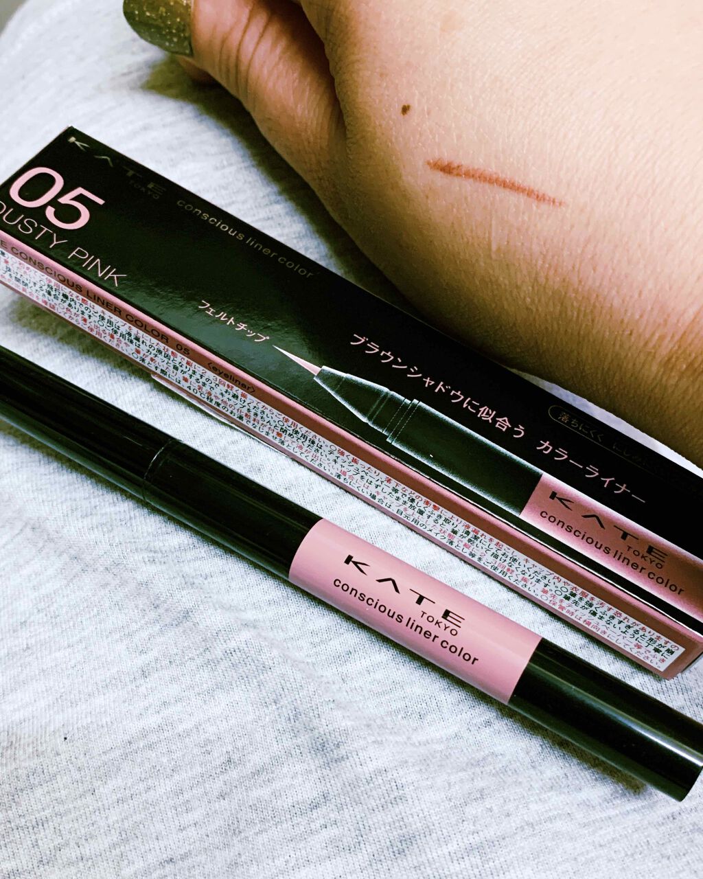 液含みのいいフェルトチップです。にじみにくくこすっても全然落ちませんがお湯オフタイプなのでお湯で簡単に落ちます。 ブラウンとラベンダーが混ざってくすみのある落ち着いた、でも少しかわいさもある色味です。 発色はよくて派手にならずにどの色のアイシャドウとでも合うと思います。