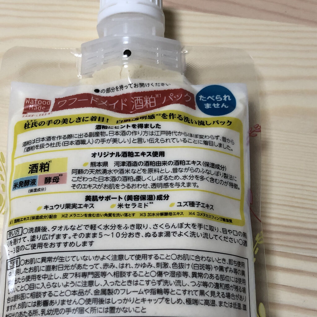 - おうちで簡単に酒粕※2パックが楽しめる、洗い流しパック。 熊本県河津酒造の酒粕から抽出した、オリジナルの酒粕エキスを配合。 ●保湿成分・・・酒粕エキス・キュウリ果実エキス・コメヌカ発酵エキス・ユズ種子エキス ◆透明感のある肌※1へ オリジナル酒粕エキス※2を配合した洗い流しパックで透明感のある肌※1へ ◆熊本県河津酒造の酒粕から抽出した酒粕エキス(保湿成分)配合 ワフードメイドでは、熊本県河津酒造の酒粕から抽出した、オリジナルの酒粕エキスを配合。阿蘇の酒米を中心に国産米を精米し、阿蘇の湧水と熊本酵母(協会9号酵母)を使って、昔ながらの槽搾り製法でやさしく搾られた酒粕のエキスを使用しています。 ◆美肌サポート(美容保湿)成分配合 厳選した原料から抽出した植物エキスをぜいたくに配合。