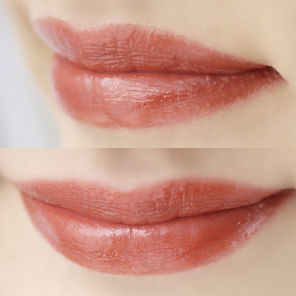 深みのあるブラウンレッドで暗めだけど少し柔らかさもある絶妙な色味がたまらなく可愛い!! 寒くなるこれからの季節はブラウンリップとか濃いめのリップを付けたくなる私には本当にピッタリなリップ🙌🏻 塗りたても十分ツヤがあるんだけど、触らないで少し置くとちゅるんちゅるんになるの!!