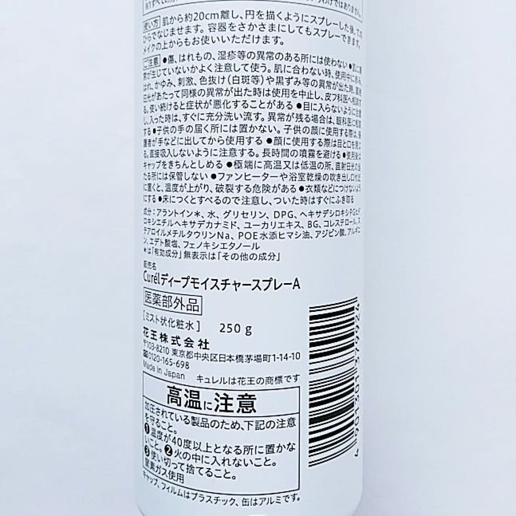 - 【敏感肌用】 微細化したセラミド機能成分*が肌の奥(角層)まで浸透。 ひと吹きで潤ったやわらかな肌に保ちます。 *ヘキサデシロキシPGヒドロキシエチルヘキサデカナミド ●消炎剤配合(有効成分)配合。肌荒れを防ぐ。 ●潤い成分(ユーカリエキス)配合。 ●ケアしづらい背中や腰など、全身に。 ●一日中、顔やからだにいつでもどこでも潤い補給。 お風呂あがりに。メイクの上から。お子さまのデリケートな肌にも。 (医薬部外品) 商品に関するお問い合わせ 受付時間9:00~17:00(土曜・日曜・祝日除く) *製品の誤飲・誤食など緊急の場合は、受付時間外でもお電話ください キュレル:0120-165-698