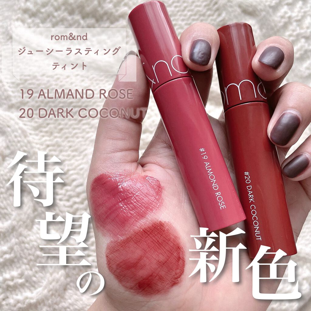 ロムアンドのジューシーラスティングティントで解決! 色持ちの良さは勿論のこと、ツヤ感やうるおいとも両立が可能です😄🌸 19 ALMOND ROSEはくすみ感のあるローズカラーでかわいくてお気に入り! 絶妙な色合いなのですが、元から血色の良い唇のように仕上げてくれ、ナチュラルになじんでくれるので何方でも使いやすいと思います。 20 DARK COCONUTは塗り重ねる程深みを出すことのできる、ダークなカラー。 チョコレートのような色味で、いつもよりも大人に、ちょっと背伸びをしたいなという時に特にオススメです。