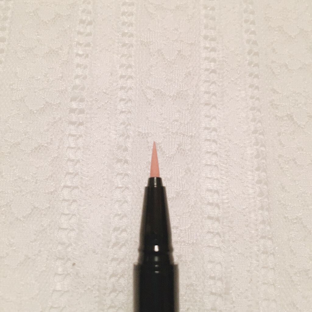 液含みのいいフェルトチップです。にじみにくくこすっても全然落ちませんがお湯オフタイプなのでお湯で簡単に落ちます。 ブラウンとラベンダーが混ざってくすみのある落ち着いた、でも少しかわいさもある色味です。 発色はよくて派手にならずにどの色のアイシャドウとでも合うと思います。
