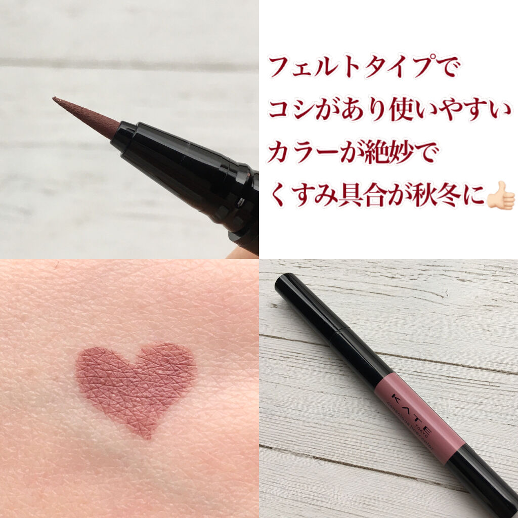 液含みのいいフェルトチップです。にじみにくくこすっても全然落ちませんがお湯オフタイプなのでお湯で簡単に落ちます。 ブラウンとラベンダーが混ざってくすみのある落ち着いた、でも少しかわいさもある色味です。 発色はよくて派手にならずにどの色のアイシャドウとでも合うと思います。