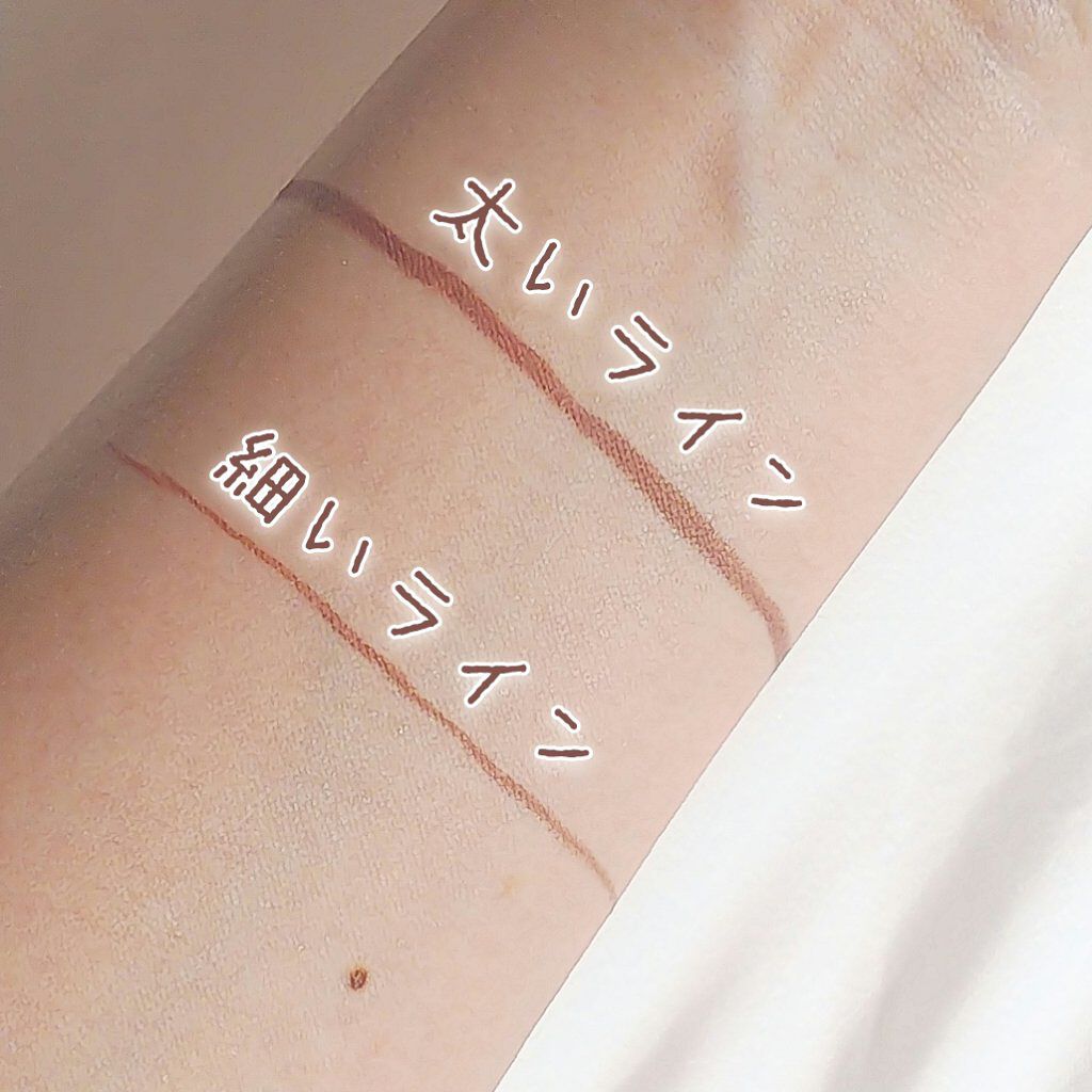 液含みのいいフェルトチップです。にじみにくくこすっても全然落ちませんがお湯オフタイプなのでお湯で簡単に落ちます。 ブラウンとラベンダーが混ざってくすみのある落ち着いた、でも少しかわいさもある色味です。 発色はよくて派手にならずにどの色のアイシャドウとでも合うと思います。