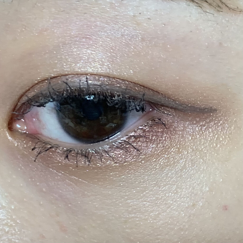 液含みのいいフェルトチップです。にじみにくくこすっても全然落ちませんがお湯オフタイプなのでお湯で簡単に落ちます。 ブラウンとラベンダーが混ざってくすみのある落ち着いた、でも少しかわいさもある色味です。 発色はよくて派手にならずにどの色のアイシャドウとでも合うと思います。