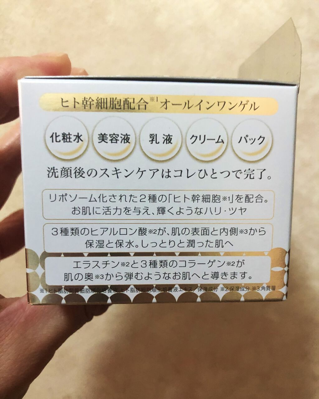 ヒト幹細胞エキス 配合。乾燥を防ぎ、うるおいとハリに満ちた肌へと導く✨️ これ1つでお手入れが完了する(化粧水・乳液・美容液・クリーム・パック)オールインワンタイプの保湿ゲルです。 さらさらとした使用感で伸びが良いです!(肌がしっとりはする)