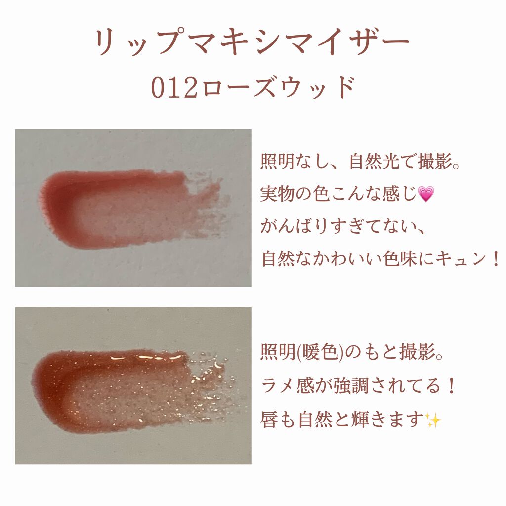マキシマイザーの保湿感は言わずもがなバッチリで、プルプル感、スースー感大好き 012ローズウッドがはちゃめちゃに可愛い!!! ピンクベージュにゴールドのラメがチラチラと入ってる 多幸感抜群だし、バブみもある👶🏻💕 可愛い仕上がりになる