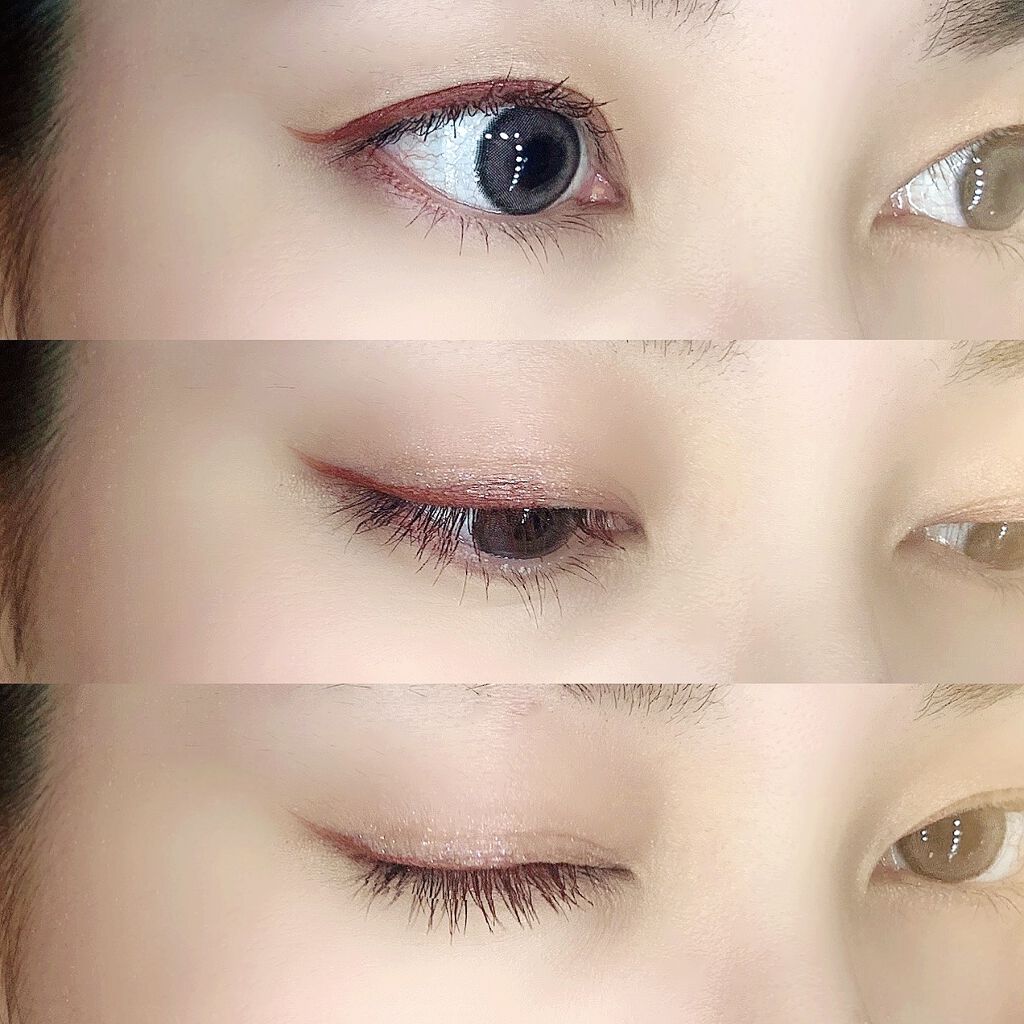 液含みのいいフェルトチップです。にじみにくくこすっても全然落ちませんがお湯オフタイプなのでお湯で簡単に落ちます。 ブラウンとラベンダーが混ざってくすみのある落ち着いた、でも少しかわいさもある色味です。 発色はよくて派手にならずにどの色のアイシャドウとでも合うと思います。