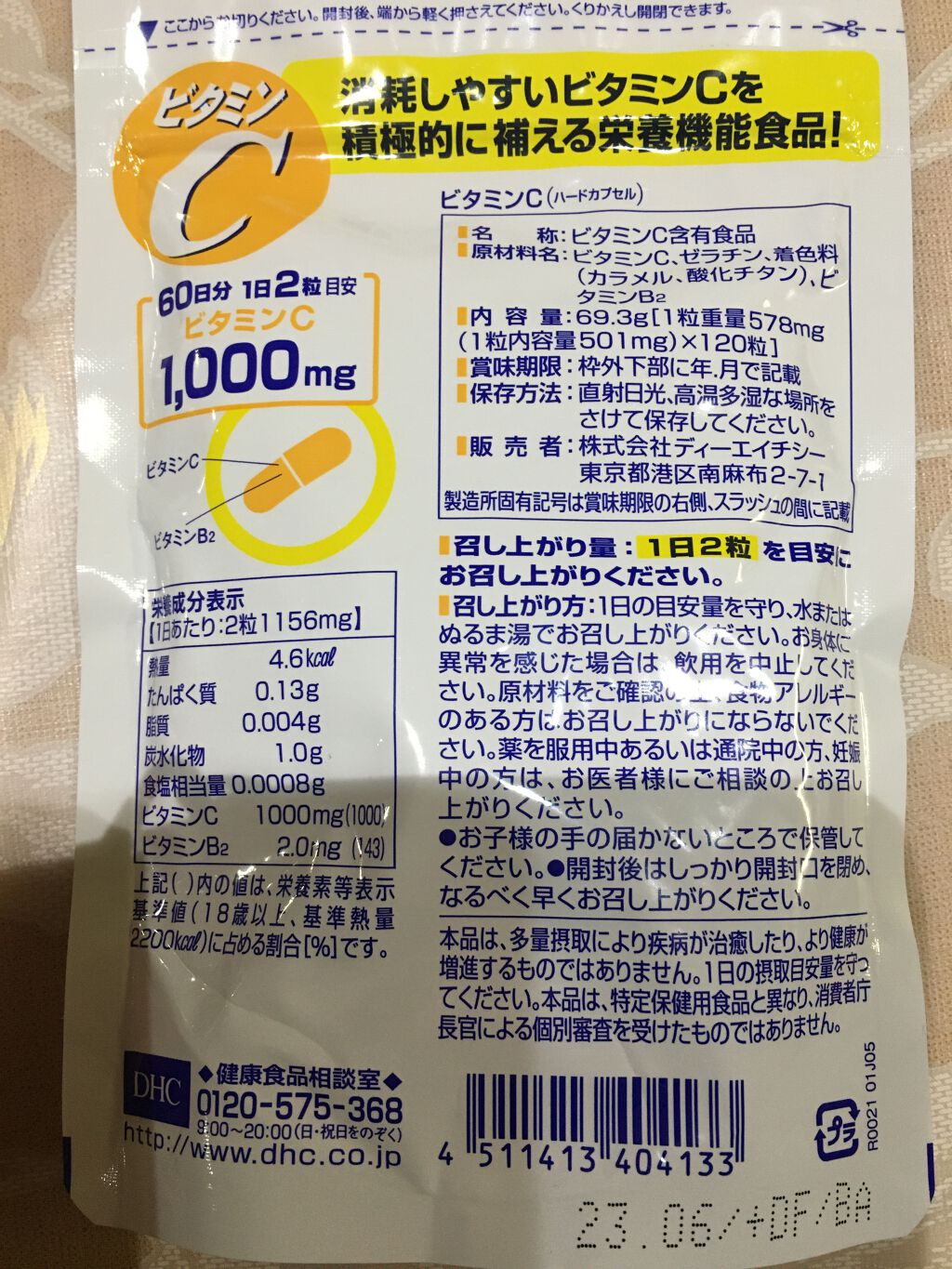 - ビタミンCとその働きを助けるビタミンB2をプラスしたサプリメントです。 ビタミンCは、皮膚や粘膜の健康維持を助けるとともに、抗酸化作用をもつ栄養素です。ハードカプセルなので、ビタミンCの酸味が苦手な方にもおすすめです。 栄養機能表示 ●ビタミンCは、皮膚や粘膜の健康維持を助けるとともに、抗酸化作用をもつ栄養素です。 ●ビタミンB2は、皮膚や粘膜の健康維持を助ける栄養素です。 ※本品は、多量摂取により疾病が治癒したり、より健康が増進するものではありません。一日の摂取目安量を守ってください。 ※本品は、特定保健用食品と異なり、消費者庁長官による個別審査を受けたものではありません。 ※水またはぬるま湯でお召し上がりください。 【名称】 ビタミンC含有食品 【原材料名】 ビタミンC、ゼラチン、着色料(カラメル、酸化チタン)、ビタミンB2 【飲み方】 一日の摂取目安量2粒 【栄養成分表示】 [1日あたり:2粒1156mg] 熱量4.5kcal、たんぱく質0.13g、脂質0g、炭水化物1.0g、食塩相当量0.001g、ビタミンC 1000mg(1000)、ビタミンB2 2.0mg(143) 上記( )内の値は、栄養素等表示基準値(18歳以上、基準熱量2200kcal)に占める割合[%]です。 アレルギー物質 ゼラチン ※一日の目安量を守って、お召し上がりください。 ※お身体に異常を感じた場合は、摂取を中止してください。 ※特定原材料及びそれに準ずるアレルギー物質を対象範囲として表示しています。原材料をご確認の上、食物アレルギーのある方はお召し上がりにならないでください。 ※薬を服用中あるいは通院中の方、妊娠中の方は、お医者様にご相談の上お召し上がりください。 ●直射日光、高温多湿な場所をさけて保存してください。 ●お子様の手の届かないところで保管してください。 ●開封後はしっかり開封口を閉め、なるべく早くお召し上がりください。 食生活は、主食、主菜、副菜を基本に、食事のバランスを。