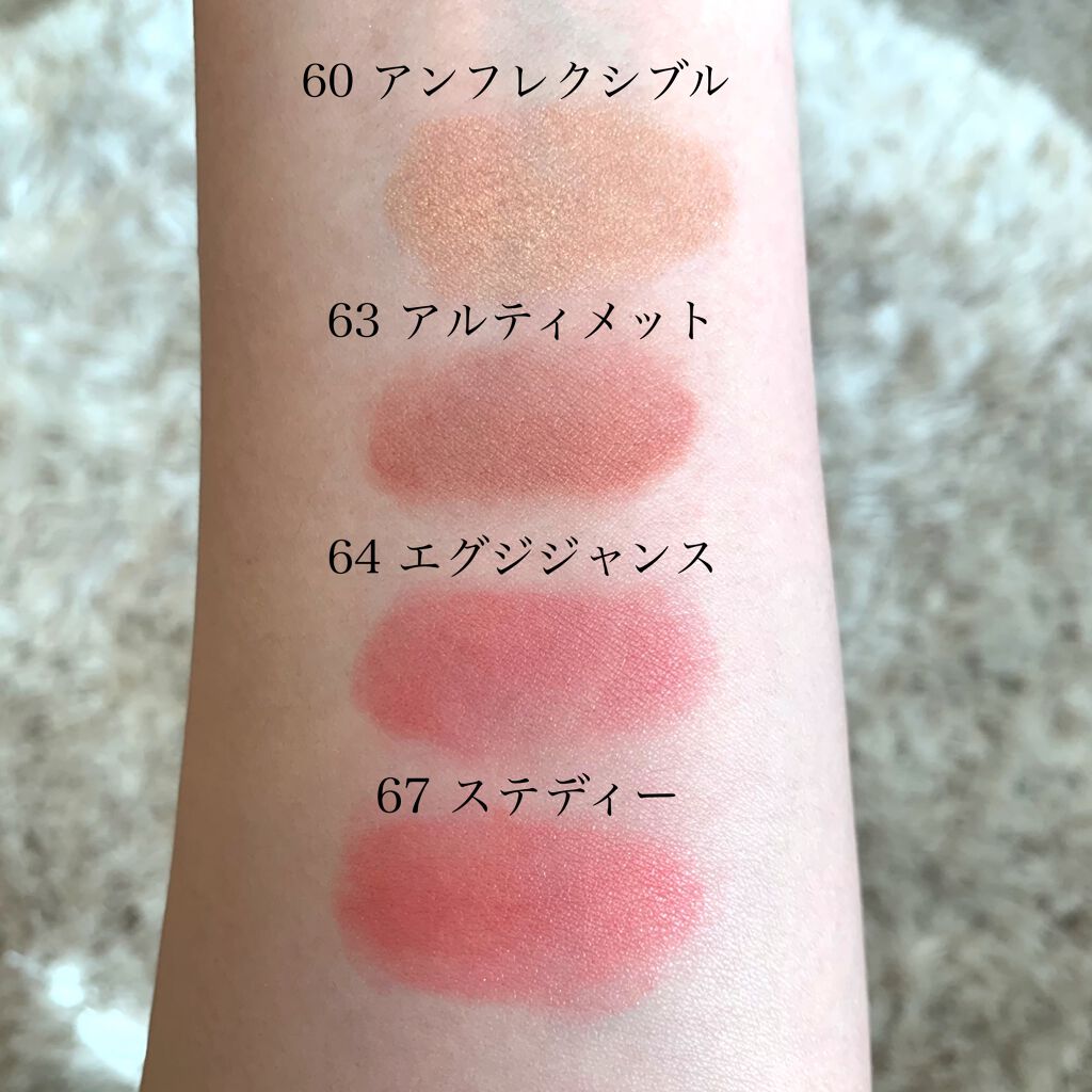 - <60 アンフレクシブル> イソドデカン、ジメチコン、リンゴ酸ジイソステアリル、(ビスヒドロキシプロピルジメチコン/SMDI)コポリマー、トリメチルシロキシケイ酸、合成ワックス、(エチレン/プロピレン)コポリマー、1,2-ヘキサンジオール、ジステアルジモニウムヘクトライト、ホウケイ酸(Ca/Na)、合成フルオロフロゴパイト、炭酸プロピレン、香料、タルク、アルムK、酢酸トコフェロール、酸化スズ、カオリン、スオウ樹皮エキス、マイカ、酸化鉄、酸化チタン <62 スティル> イソドデカン、ジメチコン、リンゴ酸ジイソステアリル、(ビスヒドロキシプロピルジメチコン/SMDI)コポリマー、トリメチルシロキシケイ酸、合成ワックス、(エチレン/プロピレン)コポリマー、1,2-ヘキサンジオール、ジステアルジモニウムヘクトライト、炭酸プロピレン、アルミナ、香料、タルク、アルムK、酢酸トコフェロール、シリカ、カオリン、スオウ樹皮エキス、マイカ、酸化チタン、酸化鉄、黄5、赤202、青1、黄4 <63 アルティメット> イソドデカン、ジメチコン、リンゴ酸ジイソステアリル、(ビスヒドロキシプロピルジメチコン/SMDI)コポリマー、トリメチルシロキシケイ酸、合成ワックス、(エチレン/プロピレン)コポリマー、1,2-ヘキサンジオール、ジステアルジモニウムヘクトライト、炭酸プロピレン、香料、アルミナ、タルク、アルムK、酢酸トコフェロール、シリカ、カオリン、スオウ樹皮エキス、マイカ、酸化チタン、酸化鉄、黄5、赤202、青1 <64 エグジジャンス> イソドデカン、ジメチコン、リンゴ酸ジイソステアリル、(ビスヒドロキシプロピルジメチコン/SMDI)コポリマー、トリメチルシロキシケイ酸、合成ワックス、(エチレン/プロピレン)コポリマー、1,2-ヘキサンジオール、ジステアルジモニウムヘクトライト、炭酸プロピレン、香料、酸化Al、タルク、アルムK、酢酸トコフェロール、シリカ、カオリン、スオウ樹皮エキス、マイカ、酸化チタン、酸化鉄、赤202、黄5、青1、赤104(1) <66 ペルマナン> イソドデカン、ジメチコン、リンゴ酸ジイソステアリル、(ビスヒドロキシプロピルジメチコン/SMDI)コポリマー、トリメチルシロキシケイ酸、合成ワックス、(エチレン/プロピレン)コポリマー、1,2-ヘキサンジオール、ジステアルジモニウムヘクトライト、炭酸プロピレン、アルミナ、香料、タルク、アルムK、酢酸トコフェロール、シリカ、カオリン、スオウ樹皮エキス、マイカ、酸化チタン、酸化鉄、赤202、赤227、黄4 <67 ステディー> イソドデカン、ジメチコン、リンゴ酸ジイソステアリル、(ビスヒドロキシプロピルジメチコン/SMDI)コポリマー、トリメチルシロキシケイ酸、合成ワックス、(エチレン/プロピレン)コポリマー、1,2-ヘキサンジオール、ホウケイ酸(Ca/Na)、ジステアルジモニウムヘクトライト、炭酸プロピレン、香料、アルミナ、タルク、アルムK、酢酸トコフェロール、酸化スズ、カオリン、シリカ、スオウ樹皮エキス、マイカ、酸化チタン、酸化鉄、赤104(1)、黄5、赤201、赤202 <70 イモビル> イソドデカン、ジメチコン、リンゴ酸ジイソステアリル、(ビスヒドロキシプロピルジメチコン/SMDI)コポリマー、トリメチルシロキシケイ酸、合成ワックス、(エチレン/プロピレン)コポリマー、1,2-ヘキサンジオール、ジステアルジモニウムヘクトライト、炭酸プロピレン、香料、アルミナ、タルク、アルムK、酢酸トコフェロール、シリカ、カオリン、スオウ樹皮エキス、マイカ、酸化チタン、赤202、黄5 <72 アイコニック> イソドデカン、ジメチコン、リンゴ酸ジイソステアリル、(ビスヒドロキシプロピルジメチコン/SMDI)コポリマー、トリメチルシロキシケイ酸、合成ワックス、(エチレン/プロピレン)コポリマー、1,2-ヘキサンジオール、ホウケイ酸(Ca/Na)、ジステアルジモニウムヘクトライト、炭酸プロピレン、香料、アルミナ、タルク、アルムK、酢酸トコフェロール、カオリン、シリカ、スオウ樹皮エキス、酸化鉄、マイカ、酸化チタン、赤202、黄4 <73 アンヴァンシーブル> イソドデカン、ジメチコン、リンゴ酸ジイソステアリル、(ビスヒドロキシプロピルジメチコン/SMDI)コポリマー、トリメチルシロキシケイ酸、合成ワックス、(エチレン/プロピレン)コポリマー、1,2-ヘキサンジオール、ジステアルジモニウムヘクトライト、炭酸プロピレン、香料、タルク、アルムK、酢酸トコフェロール、カオリン、スオウ樹皮エキス、マイカ、黄5、赤202、赤230(1) <74 エクスペリモンテ> イソドデカン、ジメチコン、リンゴ酸ジイソステアリル、(ビスヒドロキシプロピルジメチコン/SMDI)コポリマー、トリメチルシロキシケイ酸、合成ワックス、(エチレン/プロピレン)コポリマー、1,2-ヘキサンジオール、ジステアルジモニウムヘクトライト、炭酸プロピレン、香料、タルク、アルムK、酢酸トコフェロール、カオリン、スオウ樹皮エキス、酸化鉄、マイカ、赤202、青1、黄5 <75 フィデリテ> イソドデカン、ジメチコン、リンゴ酸ジイソステアリル、(ビスヒドロキシプロピルジ