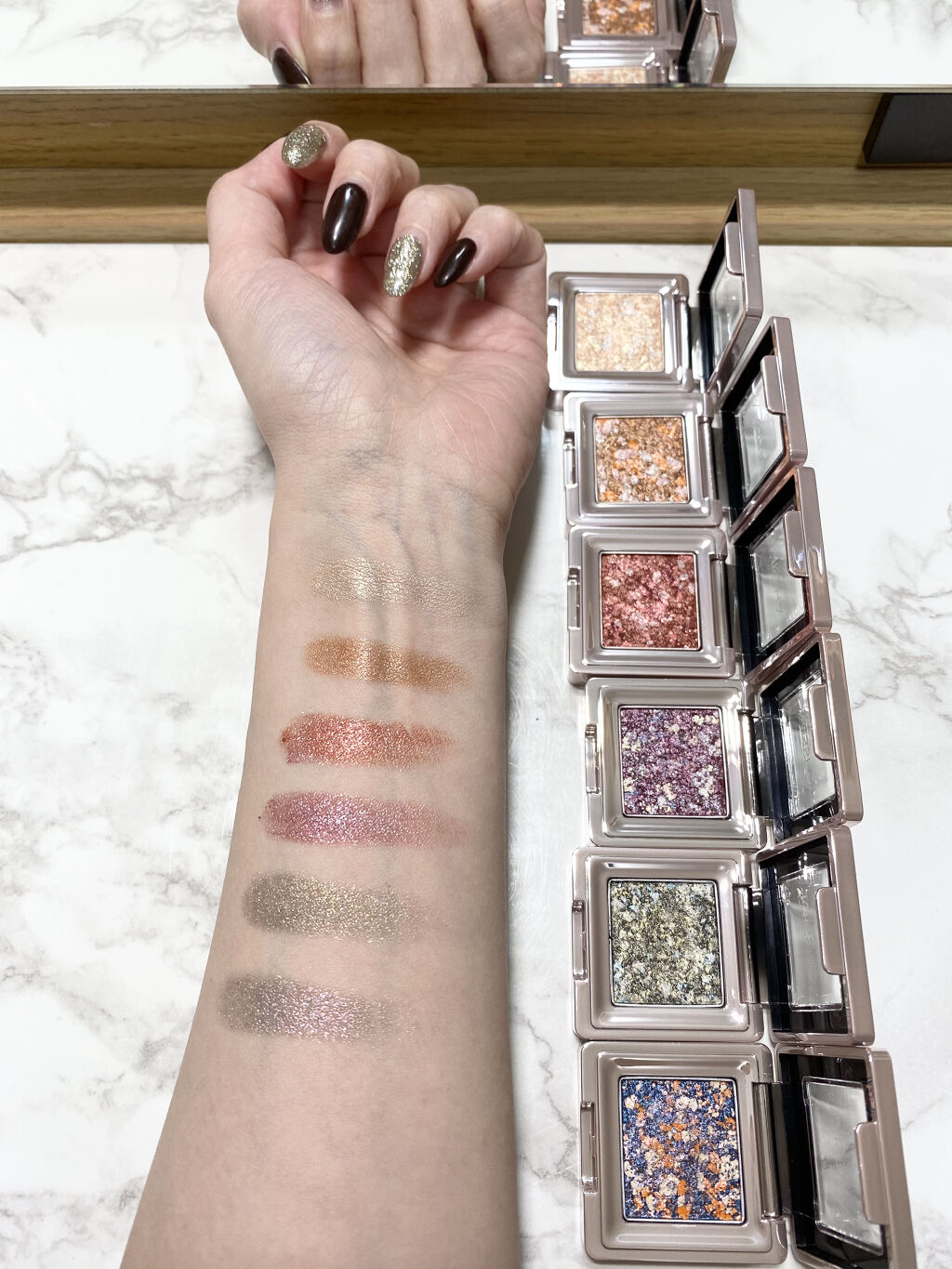 - 宝石パウダー・偏光パールにより、光の当たり方で色合いが変わるグリッターアイシャドウ。ババス油、ザクロ種子油、ホホバ種子油配合で、粉飛びしにくくまぶたにしっかり密着します。