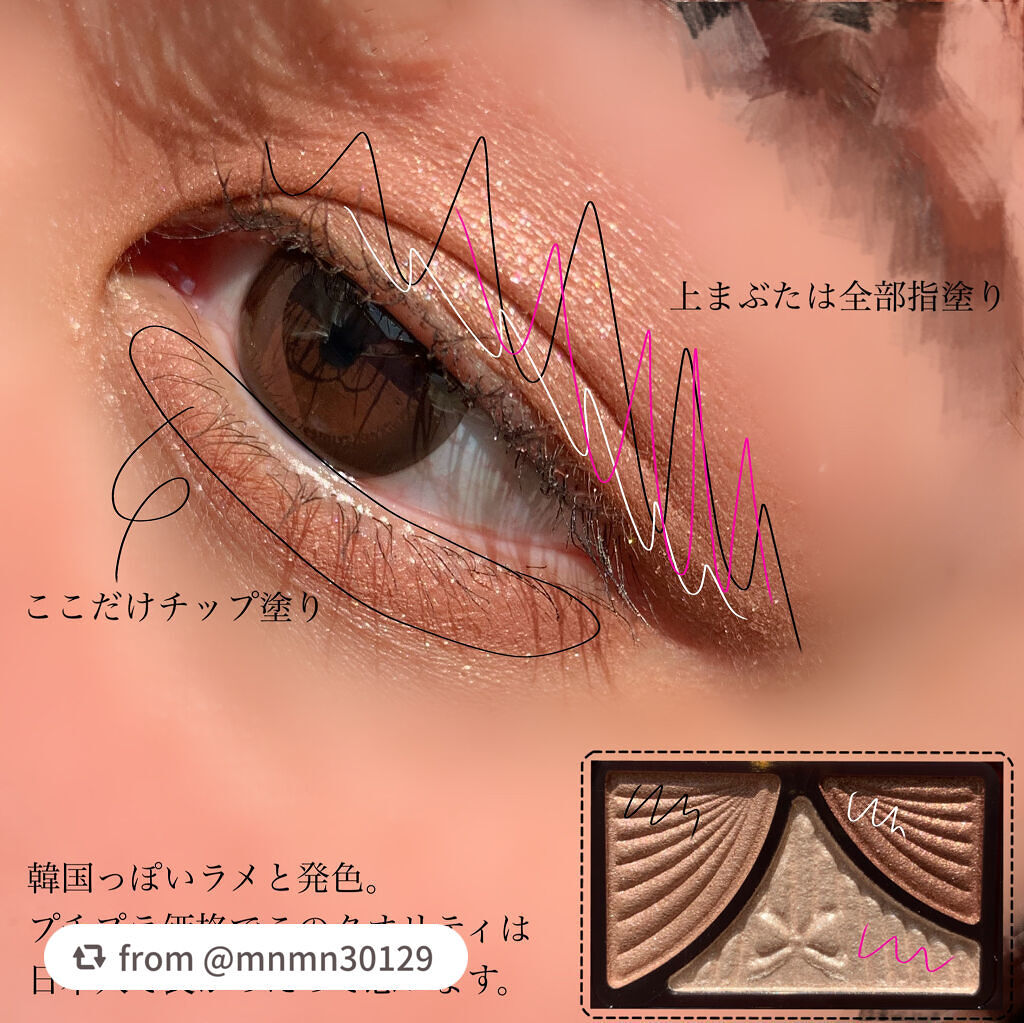 - パウダーなのにみずみずしい♥ 自然な立体感をつくりだす3色アイシャドウパレット 仕上げのコートで、ジューシー感&モチUP! メインカラー&ラインカラーはフィッティングオイル配合のしっとりパウダーで、 まぶたに吸いつくように溶け込み、ジューシーコートスフレで覆うことによって、 濡れたようにツヤめく愛されまぶたで透明感のある目元を演出します。