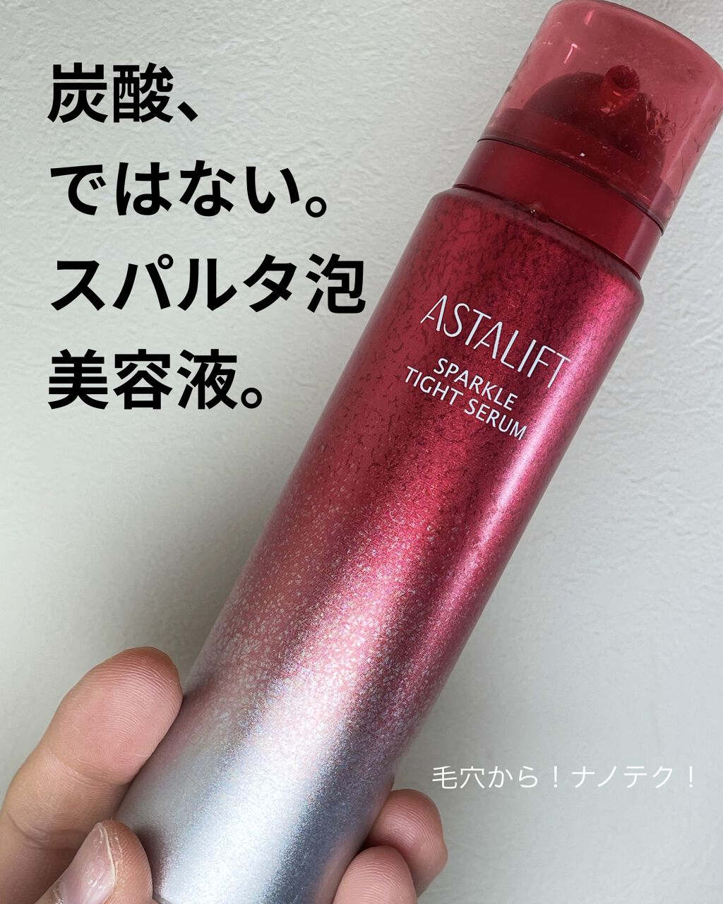 - 「アスタリフト スパークル タイト セラム」は、パチパチと弾ける泡で、肌を引き締める美容液です。独自技術によって開発した成分「ナノスパークルショット」*5が、毛穴から肌に浸透*2。美容成分を含んだみずみずしい泡が弾けて肌に刺激を与え、ジェルに変化した美容液が肌の上に広がり、肌を引き締めます。さらに、アスタリフトシリーズの特徴成分である「ナノアスタキサンチン」*7や「ナノリコピン」*8、「3種のコラーゲン」*9などの豊富な美容成分を配合し、肌のハリやうるおいもしっかりケアします。 *5 独自ナノ成分から放出されたテトラヒドロピペリン(うるおい成分) *7 ヘマトコッカスプルビアリス油(うるおい成分) *8 トマト果実エキス(うるおい成分) *9 アセチルヒドロキシプロリンを含む。うるおい成分。