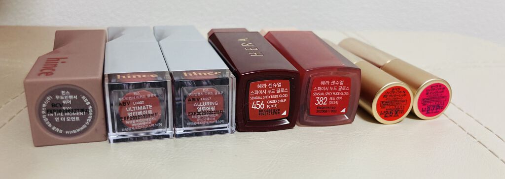 初HERAリップ初めてのHERAリップです!色味めちゃくちゃ可愛くて気に入りました!ホリデーエディションの456ジンジャーシロップ(写真左)は、こっくりしたピンクに細かいラメが入っていてとても可愛い💕382のREDlie(写真右)は、赤だけど...