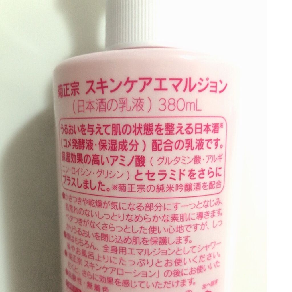 - うるおいを与えて肌の状態を整える日本酒 ※(コメ発酵液・保湿成分)配合の乳液です。 保湿効果の高いアミノ酸(グルタミン酸・アルギニン・ロイシン・グリシン)とセラミドをさらにプラスしました。 ※菊正宗の純米吟醸酒を配合 弱酸性・無着色