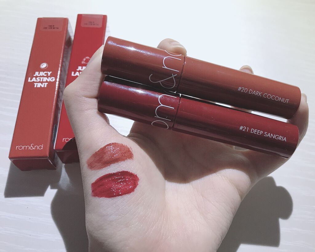 ロムアンドのジューシーラスティングティントで解決! 色持ちの良さは勿論のこと、ツヤ感やうるおいとも両立が可能です😄🌸 19 ALMOND ROSEはくすみ感のあるローズカラーでかわいくてお気に入り! 絶妙な色合いなのですが、元から血色の良い唇のように仕上げてくれ、ナチュラルになじんでくれるので何方でも使いやすいと思います。 20 DARK COCONUTは塗り重ねる程深みを出すことのできる、ダークなカラー。 チョコレートのような色味で、いつもよりも大人に、ちょっと背伸びをしたいなという時に特にオススメです。