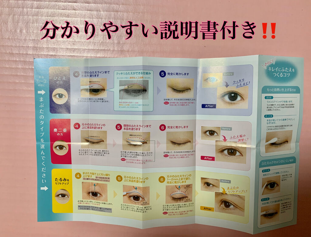 - 2020年6月3日 膜が強くなってリニューアル発売! 塗って乾かすだけのふたえ整形フィルム。見えない膜がふたえをつくり、自然なふたえが完成します。非接着タイプでまぶたを貼り付けないので、目を閉じても自然な仕上がり。まばたきしてもつっぱりません。水・汗に強いウォータプルーフでクッキリふたえをキープ。うるおい成分のヒアルロン酸・コラーゲン配合。