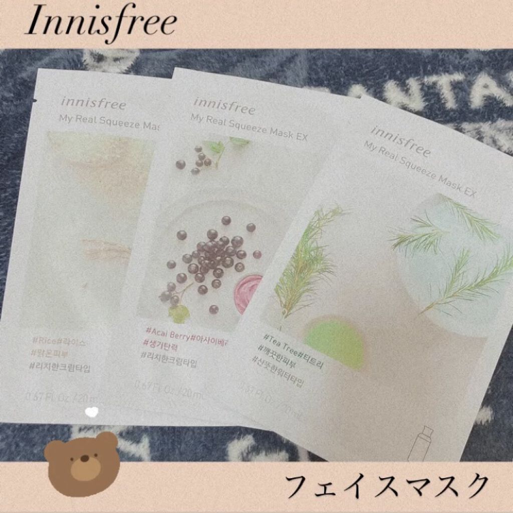 使い切り!innisfreeのマイリアルスクイーズマスクシート(MH)香りはほんのりはちみつの香り。使った後はもっちり肌を実感、しっかり保湿された感あり。10種×2で20枚入りの箱を韓国旅行でお土産に買いました!友達に配ったり自分で使ったり。...