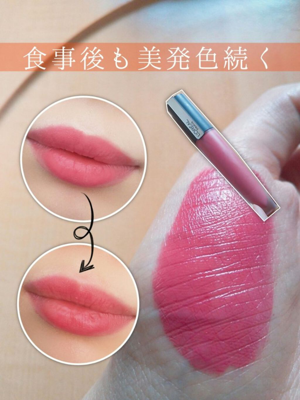 こちらのカラーが本当に大好きです!普段使いにぴったりで、軽いテクスチャーが唇に心地よいです。しっかり定着するとマスクやストローなどに移らず、長時間キープしてくれます。唇が乾燥したり、唇の質感が強調されることもなく、ほんのりとした自然なステインが残るのも魅力的です。 油分のある食べ物を食べると少し色移りすることがあります。そして、ドラッグストアコスメとしては少しお高めかもしれません。でも、このクオリティなら納得です!