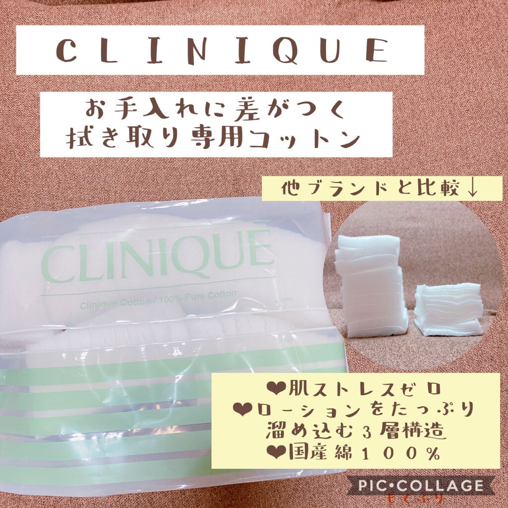 - 2年連続・年間240万個*1以上のベストセラー*2 お手入れに差がつく こだわりのコットン クリニークの代名詞、クラリファイング ローションのために開発された「クリニーク コットン N」。綿100%を使用したこだわりの日本製で、表裏は毛羽立ちしにくい特殊加工を施し、中心部はローションをたっぷり溜め込めるように太い繊維を使用した、3層構造。コットン表面の凹凸が、古い角質をからめ取って、しっかりふき取り。肌に余計なものを残さないことで、次に使うスキンケアを受け入れやすい肌へ。 原料となっている繊維は、赤ちゃんの肌にも使える安全性が認められる、繊維製品の国際規格「エコテックススタンダード100」の厳しい条件をクリア。 脱脂・漂白におけるケミカルダメージを抑える特殊製法で、マシュマロのようなやわらかい風合いに。毎日のお手入れで肌に負担をかけないよう、ふっくらとした厚みと、しっとり優しい肌触りにもこだわりました。 さあ、毎日使うものだから、心地よさと使いやすさを追求したクリニークのコットンで、差がつくスキンケアを。 *1 2016年7月〜2017年6月、2017年7月〜2018年6月の売上から集計*2クリニーク内