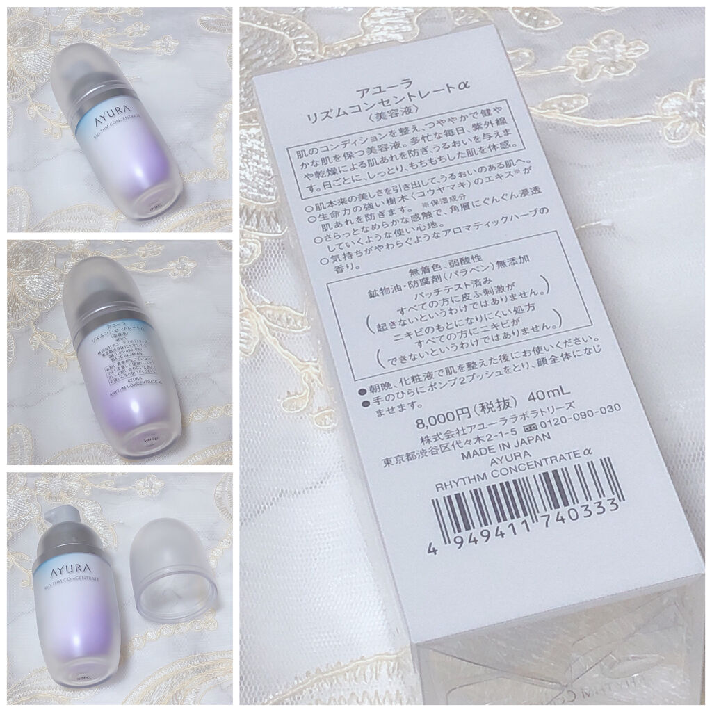 株式会社アインファーマシーズ様から商品を提供いただいたので紹介します。AYURAリズムコンセントレートα40mL税込8,800円肌のコンディションを整えくれる美容液です。まず、パッケージが可愛くてスキンケアの気分が上がります♡化粧水の後に使い...