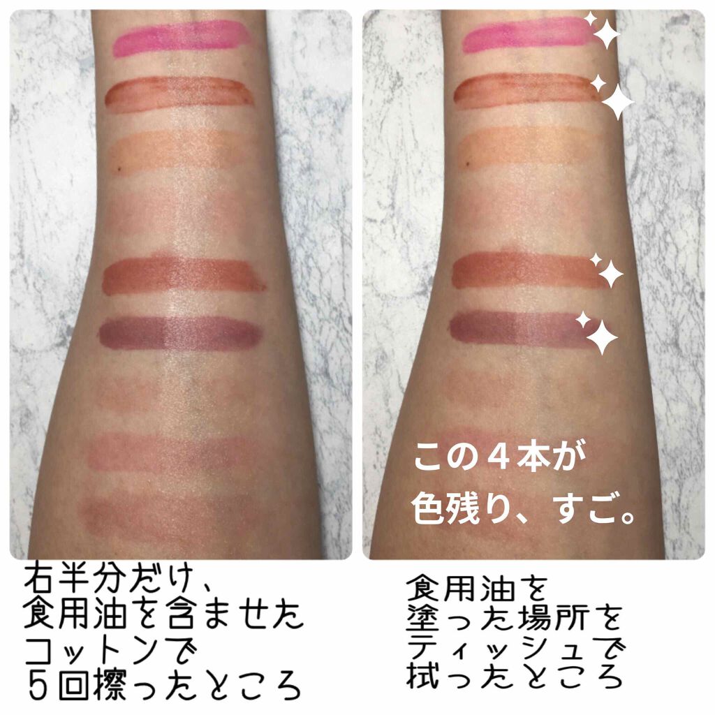 好きすぎて、今頃、全色揃えました。 リップの着画だけでは分かりにくい細かな色味は、腕のスウォッチもアップで付けました☝️ 「顔から浮く」「顔色が悪くなる」と表現してしまっていますが💦