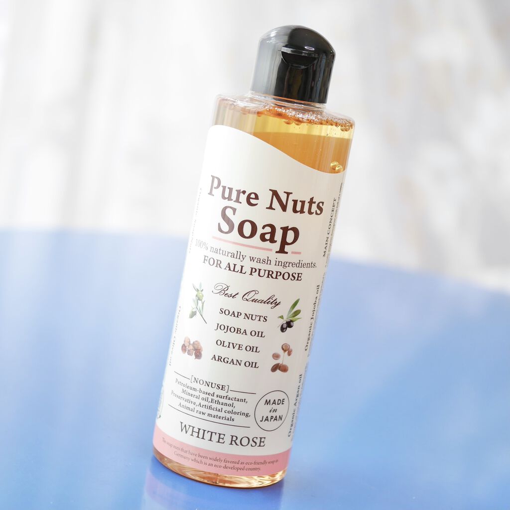 ナチュラセラピュアナッツソープホワイトローズの香り✨メイクも落とせる上に全身も洗えるオールインワンソープです!自社工場を持っているマーナーコスメチックスさんのボディケア、ピュアナッツシリーズ。ナッツ、とあるので甘い香りかな...
