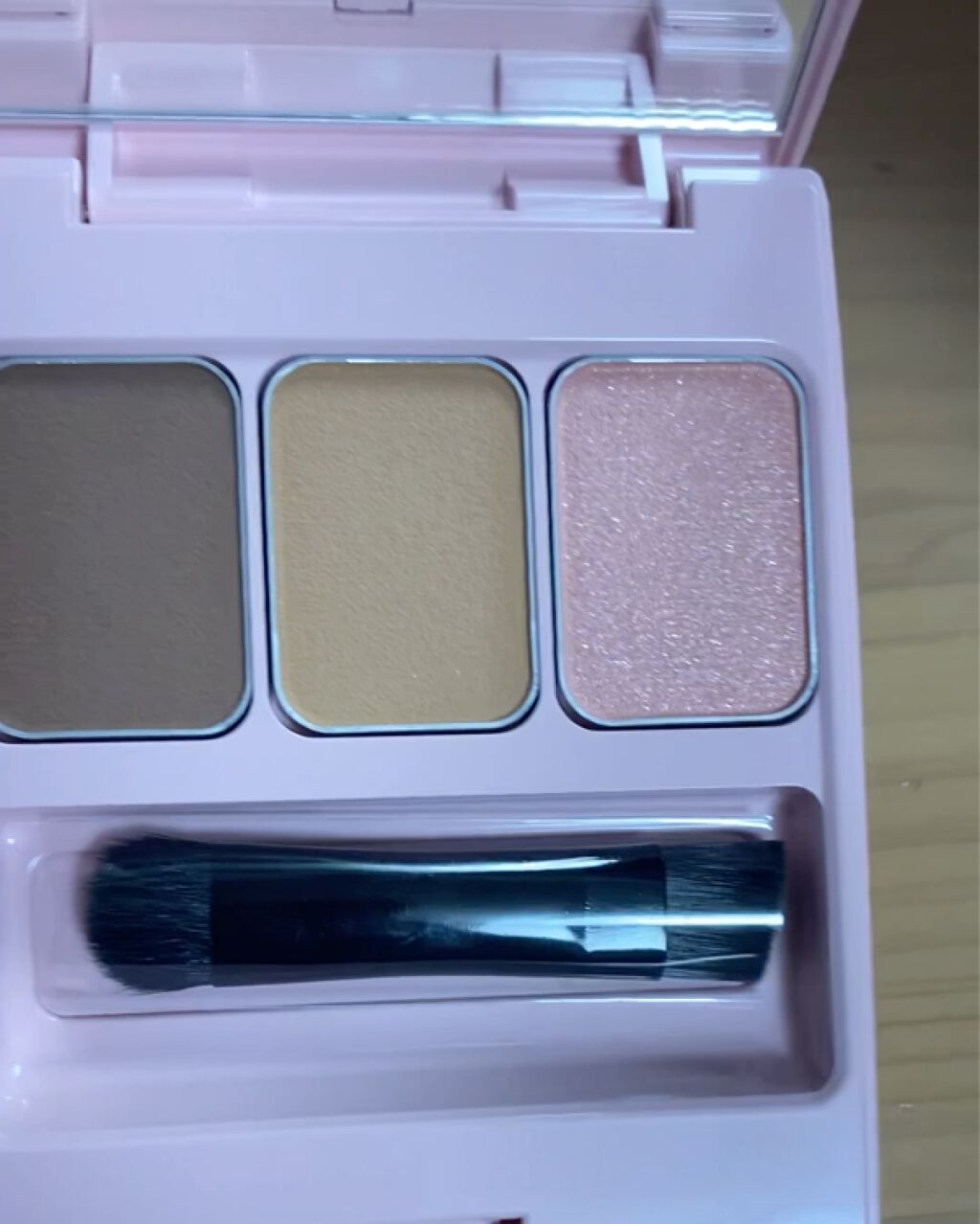 アイブロウとアイシャドウがこれ1個で完成 持ち運びに便利ですし荷物も減らせるのありがたいですね 見た目は明るいのですが塗ってみると使いやすかったです 気に入りすぎて毎日使いです。 大人も使いやすいピンクブラウン 私はWHOMEEの単色のラメと重ねたりして使ってます