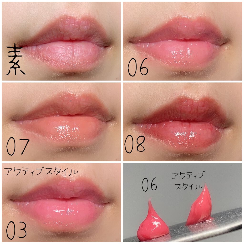 - ブルベでも、イエベでも 自然になじんでべたつかない 新感覚グロス ●塗りやすい斜めカット ●うるおい長時間持続 ●グロスなのにべたつかずサラリとフィット ●チューブの口もとを直接唇にあててのばすか、指先にとってお使いください。 ●食後にお使いになるときは、唇をひと拭きしてからご使用ください。 ●ご使用後はチューブの口もとをティッシュペーパーなどできれいに拭き、キャップをきちんと閉めてください。容器のネジ部やキャップの内側に中味がたまると、キャップを閉めたときに中味が出てくる場合があります。そのため、いつも清潔にしてお使いください。 ●日のあたるところや高温のところにおかないでください。 ●保管条件によって、最初に透明のオイルがにじみ出ることがありますが、品質に問題ありません。 ●衣服やその他のものにつくと落ちませんので、ご注意ください。