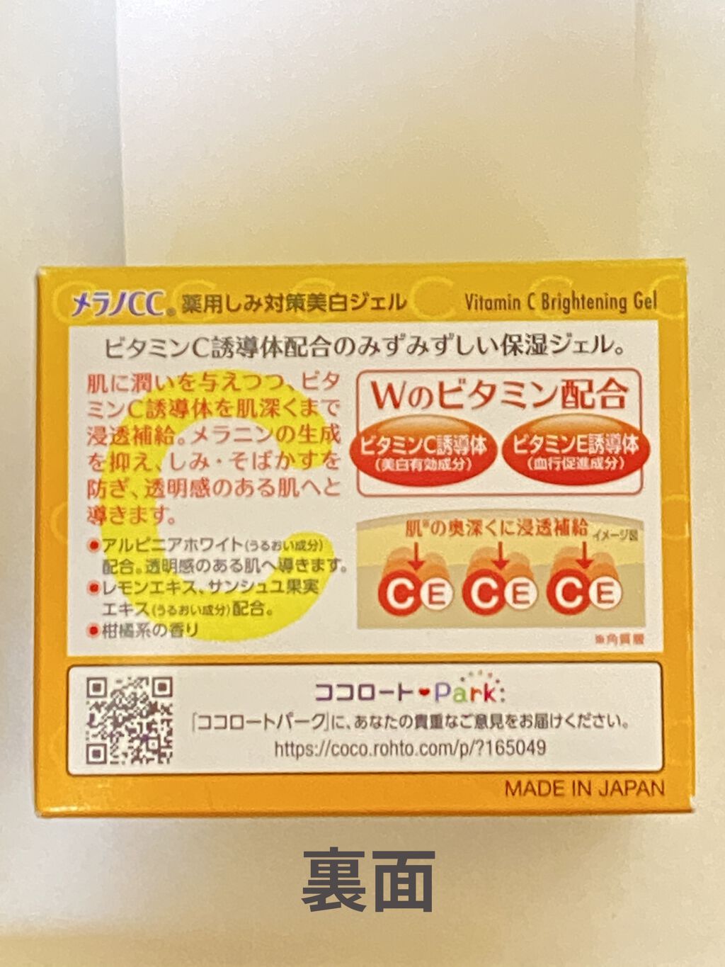 - 「メラノCC 薬用しみ対策美白ジェル」は、有効成分ビタミンC誘導体※1配合のみずみずしい保湿ジェル。 肌に潤いを与えつつ、ビタミンC誘導体を角質層の奥深くまで浸透補給。メラニンの生成を抑え、しみ・そばかすを防ぎ、透明感のある肌へと導きます。 整肌成分「ビタミンE誘導体※2」・抗炎症成分「グリチルリチン酸ジカリウム」も配合。気になるニキビもしっかり予防します。さらに、うるおい成分「アルピニアホワイト※3」も配合。ニキビ痕が気になる肌にもうるおいを与えて肌を整えます。 化粧水や美容液などの後、うるおいを補給したい時に乳液やクリーム代わりとしてお使いいただけます。また、紫外線を浴びてしまったボディへの使用もオススメです。朝晩のお手入れにどうぞ。 柑橘系の香り。 ※1:L-アスコルビン酸2-グルコシド ※2:トコフェロール酢酸エステル ※3:アルピニアカツマダイ種子エキス