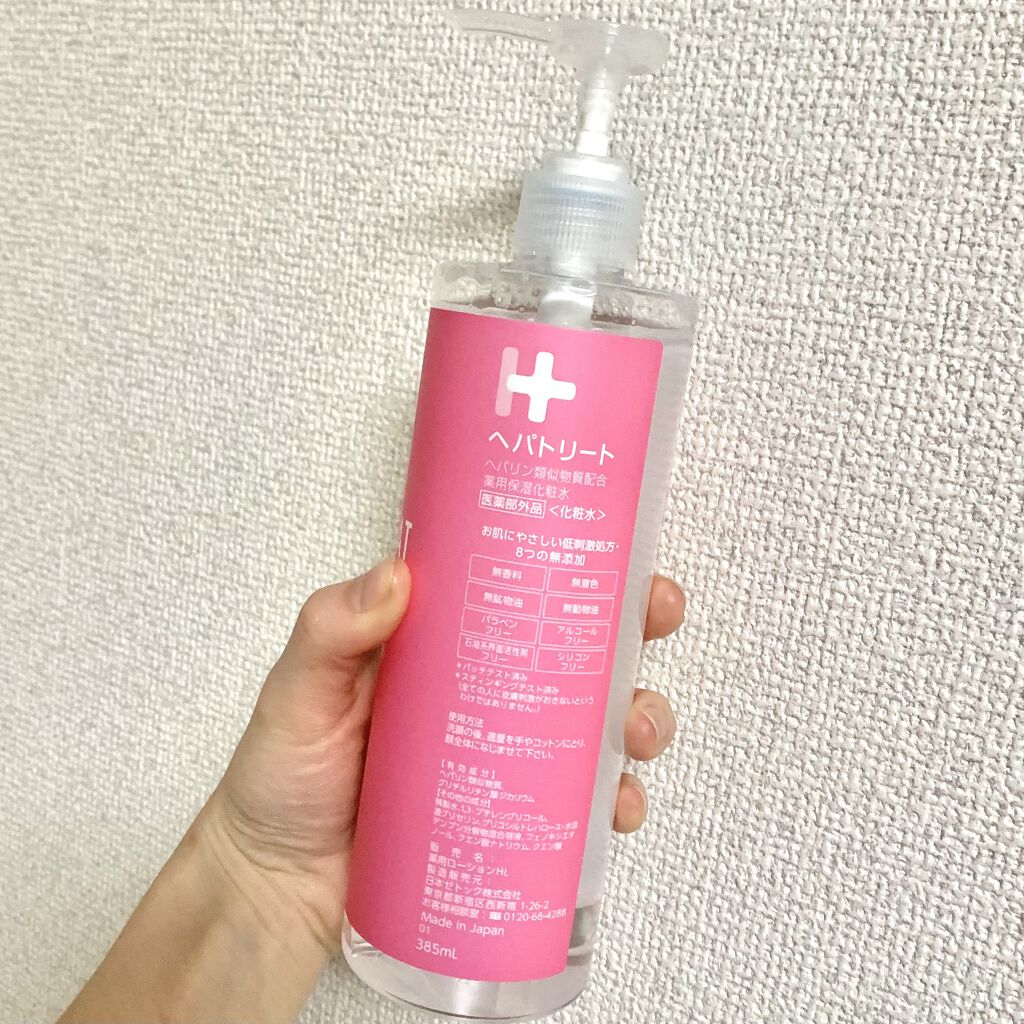 - ヘパトリートは保水有効成分のヘパリン類似物質と肌あれ有効成分のグリチルリチン酸ジカリウムを配合し、8つのフリーを実現。低刺激処方ながら高機能な化粧水です。さらに、薬用化粧水では珍しい大容量ポンプ(385mL)でとても使いやすく、赤ちゃんから大人まで、顔や全身の肌あれ・乾燥に使えます。 ■Wの有効成分 1.ヘパリン類似物質 顔・全身の乾燥を防ぐ 肌の乾燥による肌あれ/あれ性/皮膚を健やかに保つ/肌を整える/あせも/ひび/あかぎれ 2.グリチルリチン酸ジカリウム ニキビを防ぐ/肌をひきしめる/日やけ、雪やけ後のほてりを防ぐ/しもやけ/かみそりまけを防ぐ ■肌にやさしい低刺激処方<8つのフリー> 無香料/無着色/無鉱物油/無動物油/パラベンフリー/アルコールフリー/石油系界面活性剤フリー/シリコンフリー ※パッチテスト済み ※スティンギングテスト済み