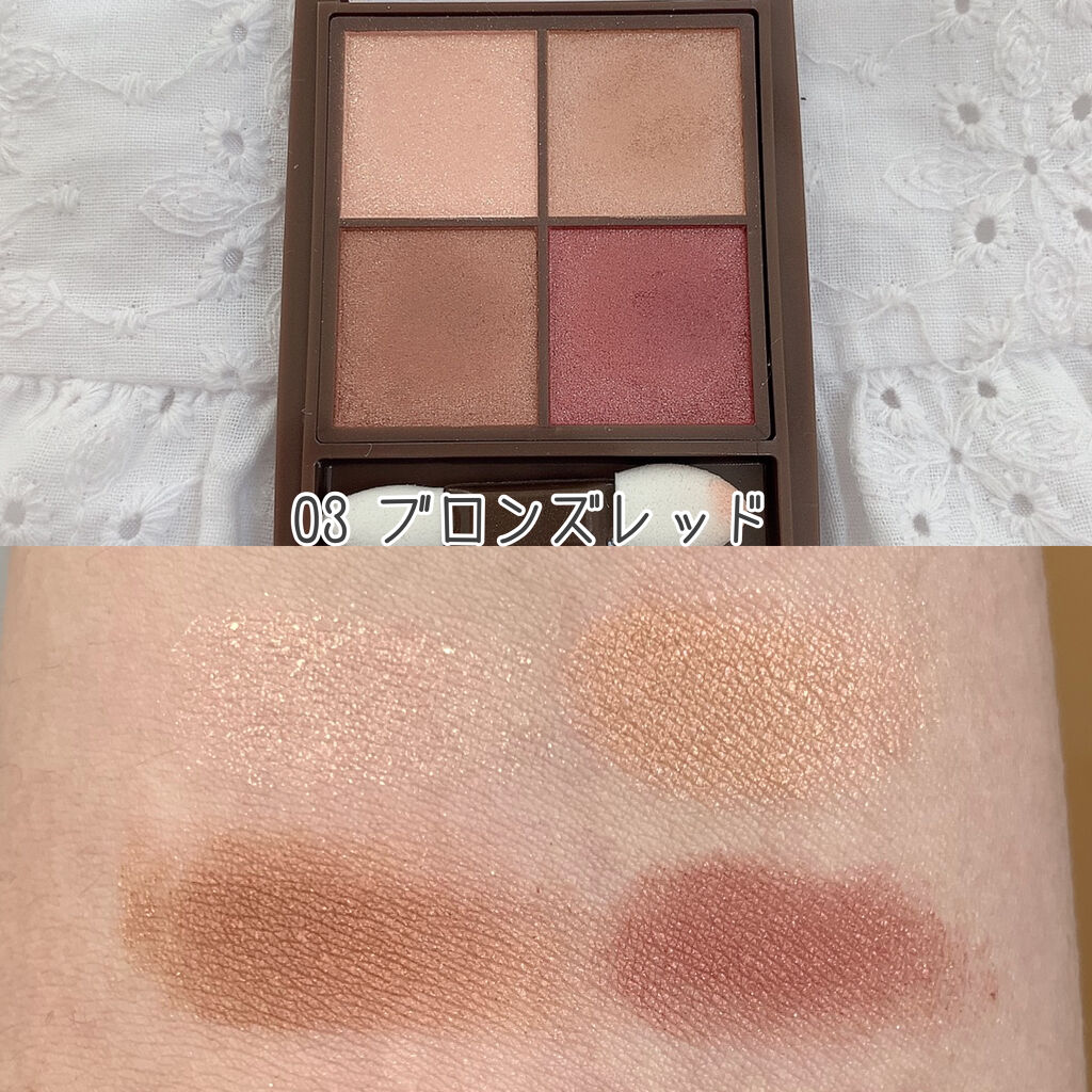- <01 ウォームコーラル> リンゴ酸ジイソステアリル、トリイソステアリン酸ポリグリセリル-2、トリエチルヘキサノイン、メタクリル酸メチルクロスポリマー、窒化ホウ素、ミリスチン酸亜鉛、シリカ、ヘキサ(ヒドロキシステアリン酸/ステアリン酸/ロジン酸)ジペンタエリスリチル、ペンチレングリコール、ビスジグリセリルポリアシルアジペート-2、フェノキシエタノール、メチルパラベン、トコフェロール、スクワラン、オリーブ果実油、ホホバ種子油、マカデミア種子油、カニナバラ果実油、タルク、マイカ、合成フルオロフロゴパイト、酸化チタン、酸化鉄、ホウケイ酸(Ca/チタン)、酸化スズ、赤202、水酸化Al <02 ローズクォーツ> リンゴ酸ジイソステアリル、トリイソステアリン酸ポリグリセリル-2、トリエチルヘキサノイン、メタクリル酸メチルクロスポリマー、窒化ホウ素、ミリスチン酸亜鉛、シリカ、ヘキサ(ヒドロキシステアリン酸/ステアリン酸/ロジン酸)ジペンタエリスリチル、ペンチレングリコール、ビスジグリセリルポリアシルアジペート-2、フェノキシエタノール、メチルパラベン、トコフェロール、スクワラン、オリーブ果実油、ホホバ種子油、マカデミア種子油、カニナバラ果実油、タルク、合成フルオロフロゴパイト、マイカ、酸化チタン、酸化鉄、ホウケイ酸(Ca/チタン)、グンジョウ、赤202、酸化スズ、赤226、黄4、水酸化Al、マンガンバイオレット <03 ブロンズレッド> リンゴ酸ジイソステアリル、トリイソステアリン酸ポリグリセリル-2、トリエチルヘキサノイン、メタクリル酸メチルクロスポリマー、窒化ホウ素、ミリスチン酸亜鉛、シリカ、ヘキサ(ヒドロキシステアリン酸/ステアリン酸/ロジン酸)ジペンタエリスリチル、ペンチレングリコール、ビスジグリセリルポリアシルアジペート-2、フェノキシエタノール、メチルパラベン、トコフェロール、スクワラン、オリーブ果実油、ホホバ種子油、マカデミア種子油、カニナバラ果実油、タルク、マイカ、合成フルオロフロゴパイト、酸化鉄、酸化チタン、ホウケイ酸(Ca/チタン)、グンジョウ、赤202、水酸化Al、酸化スズ <04 キャメルブラウン> リンゴ酸ジイソステアリル、トリイソステアリン酸ポリグリセリル-2、トリエチルヘキサノイン、メタクリル酸メチルクロスポリマー、窒化ホウ素、ミリスチン酸亜鉛、シリカ、ヘキサ(ヒドロキシステアリン酸/ステアリン酸/ロジン酸)ジペンタエリスリチル、ペンチレングリコール、ビスジグリセリルポリアシルアジペート-2、フェノキシエタノール、メチルパラベン、トコフェロール、スクワラン、オリーブ果実油、ホホバ種子油、マカデミア種子油、カニナバラ果実油、タルク、マイカ、合成フルオロフロゴパイト、酸化鉄、酸化チタン、ホウケイ酸(Ca/チタン)、赤226、酸化スズ、水酸化Al