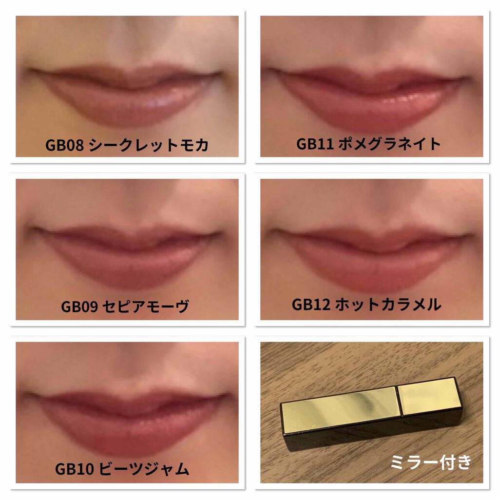 - <GB03 アプリコットシナモン> リンゴ酸ジイソステアリル、テトラエチルヘキサン酸ペンタエリスリチル、トリイソステアリン酸ポリグリセリル-2、水添ポリイソブテン、ヒドロキシアルキル(C16-18)ヒドロキシダイマージリノレイルエーテル、ワセリン、ポリエチレン、キャンデリラロウエステルズ、マイクロクリスタリンワックス、水添ポリデセン、アルガニアスピノサ核油、セラミドEOP、セラミドNG、セラミドNP、セラミドAP、水添レシチン、ダイズステロール、(HDI/トリメチロールヘキシルラクトン)クロスポリマー、カプリル酸グリセリル、トコフェロール、硫酸Ba、(+/-) シリカ、ラウロイルリシン、黄4、黄5、酸化チタン、酸化鉄、水酸化Al、青1、赤104(1)、赤201、赤202 <GB06 ショコラベリー> テトラエチルヘキサン酸ペンタエリスリチル、リンゴ酸ジイソステアリル、トリイソステアリン酸ポリグリセリル-2、水添ポリイソブテン、ヒドロキシアルキル(C16-18)ヒドロキシダイマージリノレイルエーテル、ワセリン、ポリエチレン、キャンデリラロウエステルズ、マイクロクリスタリンワックス、水添ポリデセン、アルガニアスピノサ核油、セラミドEOP、セラミドNG、セラミドNP、セラミドAP、水添レシチン、ダイズステロール、(HDI/トリメチロールヘキシルラクトン)クロスポリマー、カプリル酸グリセリル、トコフェロール、硫酸Ba、シリカ、ラウロイルリシン、黄4、黄5、酸化チタン、酸化鉄、水酸化Al、青1、赤201、赤202 <GB08 シークレットモカ> リンゴ酸ジイソステアリル、テトラエチルヘキサン酸ペンタエリスリチル、トリイソステアリン酸ポリグリセリル-2、水添ポリイソブテン、ヒドロキシアルキル(C16-18)ヒドロキシダイマージリノレイルエーテル、ワセリン、ポリエチレン、キャンデリラロウエステルズ、マイクロクリスタリンワックス、水添ポリデセン、アルガニアスピノサ核油、セラミドEOP、セラミドNG、セラミドNP、セラミドAP、(HDI/トリメチロールヘキシルラクトン)クロスポリマー、カプリル酸グリセリル、トコフェロール、フィトステロールズ、水添レシチン、硫酸Ba、(+/-) シリカ、ラウロイルリシン、黄4、黄5、酸化チタン、酸化鉄、水酸化Al、青1、赤104(1)、赤201、赤202 <GB09 セピアモーヴ> リンゴ酸ジイソステアリル、テトラエチルヘキサン酸ペンタエリスリチル、トリイソステアリン酸ポリグリセリル-2、水添ポリイソブテン、ヒドロキシアルキル(C16-18)ヒドロキシダイマージリノレイルエーテル、ワセリン、ポリエチレン、キャンデリラロウエステルズ、マイクロクリスタリンワックス、水添ポリデセン、アルガニアスピノサ核油、セラミドEOP、セラミドNG、セラミドNP、セラミドAP、(HDI/トリメチロールヘキシルラクトン)クロスポリマー、カプリル酸グリセリル、トコフェロール、フィトステロールズ、水添レシチン、硫酸Ba、(+/-) シリカ、ラウロイルリシン、黄4、黄5、酸化チタン、酸化鉄、水酸化Al、青1、赤104(1)、赤201、赤202 <GB11 ポメグラネイト> テトラエチルヘキサン酸ペンタエリスリチル、リンゴ酸ジイソステアリル、トリイソステアリン酸ポリグリセリル-2、水添ポリイソブテン、ヒドロキシアルキル(C16-18)ヒドロキシダイマージリノレイルエーテル、ワセリン、ポリエチレン、キャンデリラロウエステルズ、マイクロクリスタリンワックス、水添ポリデセン、アルガニアスピノサ核油、セラミドEOP、セラミドNG、セラミドNP、セラミドAP、(HDI/トリメチロールヘキシルラクトン)クロスポリマー、カプリル酸グリセリル、トコフェロール、フィトステロールズ、水添レシチン、硫酸Ba、(+/-) シリカ、ラウロイルリシン、黄4、黄5、酸化チタン、酸化鉄、水酸化Al、青1、赤201、赤202 <GB12 ホットカラメル> リンゴ酸ジイソステアリル、テトラエチルヘキサン酸ペンタエリスリチル、トリイソステアリン酸ポリグリセリル-2、水添ポリイソブテン、ヒドロキシアルキル(C16-18)ヒドロキシダイマージリノレイルエーテル、ワセリン、ポリエチレン、キャンデリラロウエステルズ、マイクロクリスタリンワックス、水添ポリデセン、アルガニアスピノサ核油、セラミドEOP、セラミドNG、セラミドNP、セラミドAP、(HDI/トリメチロールヘキシルラクトン)クロスポリマー、カプリル酸グリセリル、トコフェロール、フィトステロールズ、水添レシチン、硫酸Ba、(+/-) シリカ、ラウロイルリシン、黄4、黄5、酸化チタン、酸化鉄、水酸化Al、青1、赤104(1)、赤201、赤202 <GB01 レッドガーネット> リンゴ酸ジイソステアリル、テトラエチルヘキサン酸ペンタエリスリチル、トリイソステアリン酸ポリグリセリル-2、水添ポリイソブテン、ヒドロキシアルキル(C16-18)ヒドロキシダイマージリノレイルエーテル、ワセリン、ポリエチレン、キャンデリラロウエステルズ、マイクロクリスタリンワックス、水添ポリデセン、アルガニアスピノサ核油、セラミドEOP、セラミドNG、セラミドNP、セラミドAP、水添レシチン、ダイズステロール、(HDI/トリメチロールヘキ