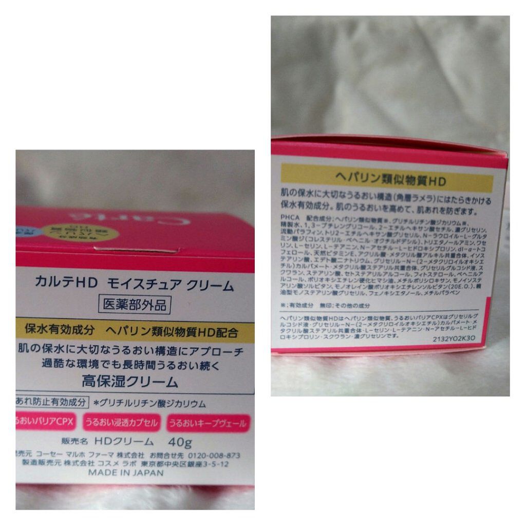- 【高保湿クリーム】 コーセーとマルホの合弁会社コーセーマルホファーマから発売された「カルテHD」。マルホから唯一供給を受けた「ヘパリン類似物質HD」を配合。 コクのあるなめらかな感触、濃密なうるおいを密閉して長時間持続する高保湿クリーム。 あれた肌を包み込むようになじむコクのあるなめらかなテクスチャー。エモリエントオイルとワセリンの配合を絶妙なバランスにしたことで、べたつかないのに長時間しっかりとしたうるおい効果を実感できます。 <販売名:HDクリーム>