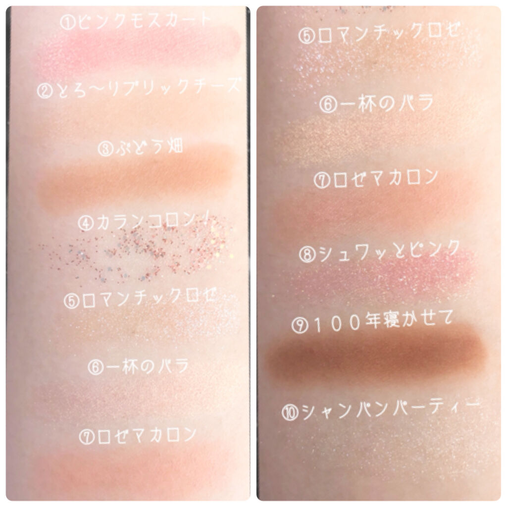 - 肌なじみの良い、鮮やかな発色で目元を華やかに彩る捨て色なしの10色アイシャドウパレット 異なる3種のテクスチャーを自由に組み合わせて、グラデーションも思いのままに。 NEW 2023.4 ・肌トーンにあう配色を詰め込んだトレンドカラー 肌トーンに合わせて、自分に似合うトレンドカラーが楽しめる♡ パーソナルカラー×トレンドカラーの掛け合わせパレットで、デイリーメイクもスペシャルメイクも気分にあわせてなりたい自分に! ・むにゅっとジェル質感ラメで高密着、煌めく目元 パレットの中でもポイントとなる大きめ粒子のラメは、ジェルのような新質感で落ちにくく肌にぴったりと密着します。キラキラとした目元をキープします。 ・使うカラーは大きめに!リアル捨て色なしパレット ベースやラメのよく使うカラーと締め色や濃い色等の減りが少ないカラーを異なるサイズで詰め込んだ、リアル捨て色なしパレット! <使用方法> 付属のデュアルシャドウブラシでベースカラーをまぶた全体に塗り広げます。細いブラシでグラデーションや目尻、アイライン、涙袋などのポイントカラーをのせて仕上げます。