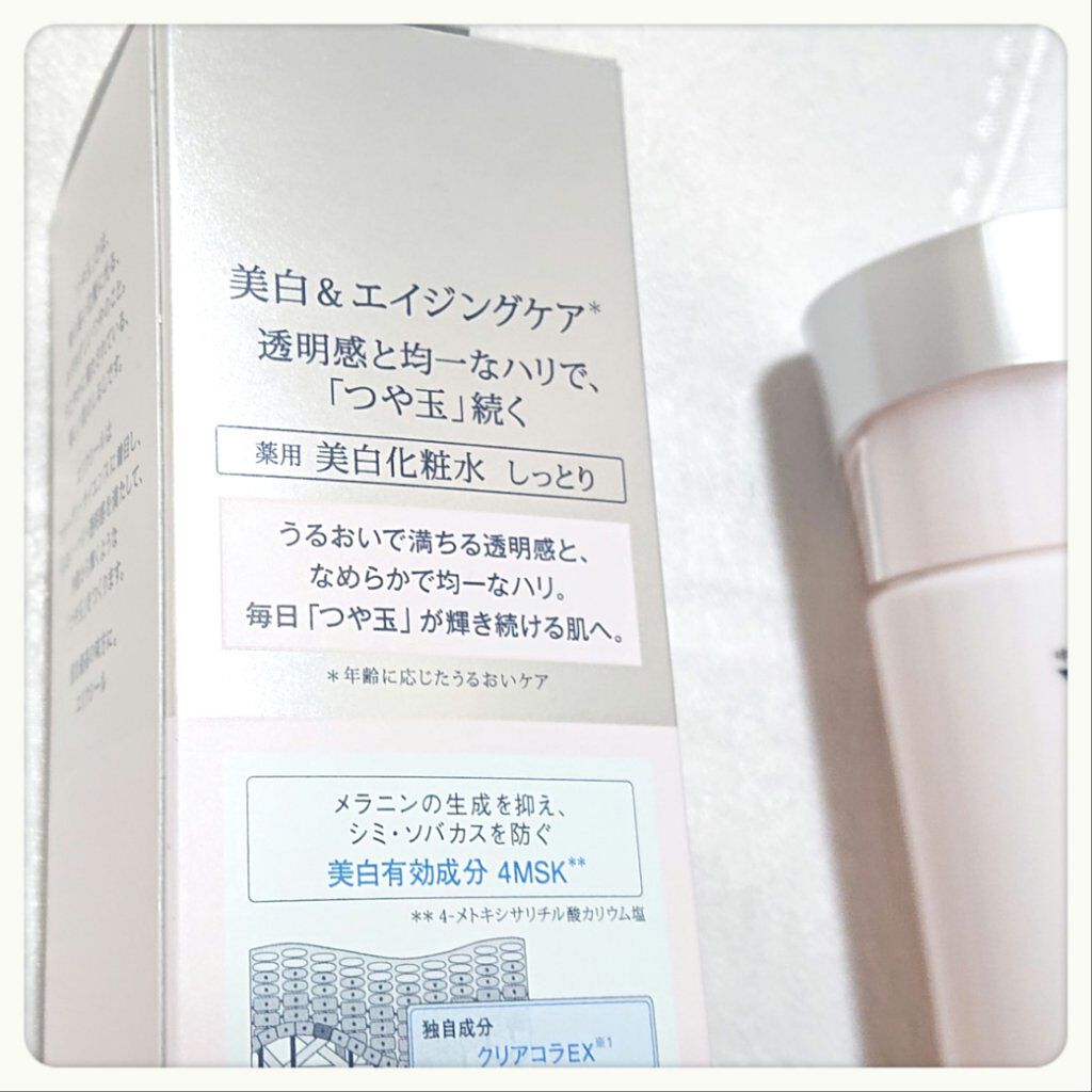- 透明感と均一なハリで「つや玉」続く美白化粧水(しっとり) 美白&エイジングケア*。透明感と均一なハリで、「つや玉」続く薬用美白化粧水。 うるおいで満ちる透明感と、なめらかで均一なハリで、毎日「つや玉」が輝き続ける肌へ。 メラニンの生成を抑え、シミ・そばかすを防ぐ、美白有効成分4MSK(4-メトキシサリチル酸カリウム塩)配合。 *年齢に応じたうるおいケア